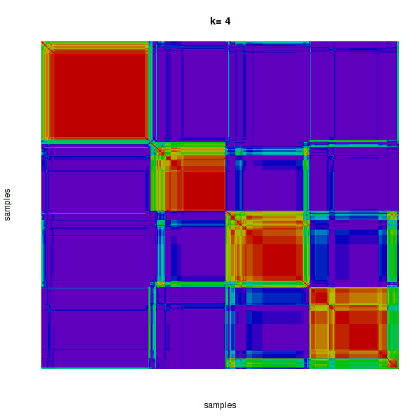 Figure 4. Get High-res Image The consensus matrix after clustering shows 4 clusters with limited overlap between clusters.