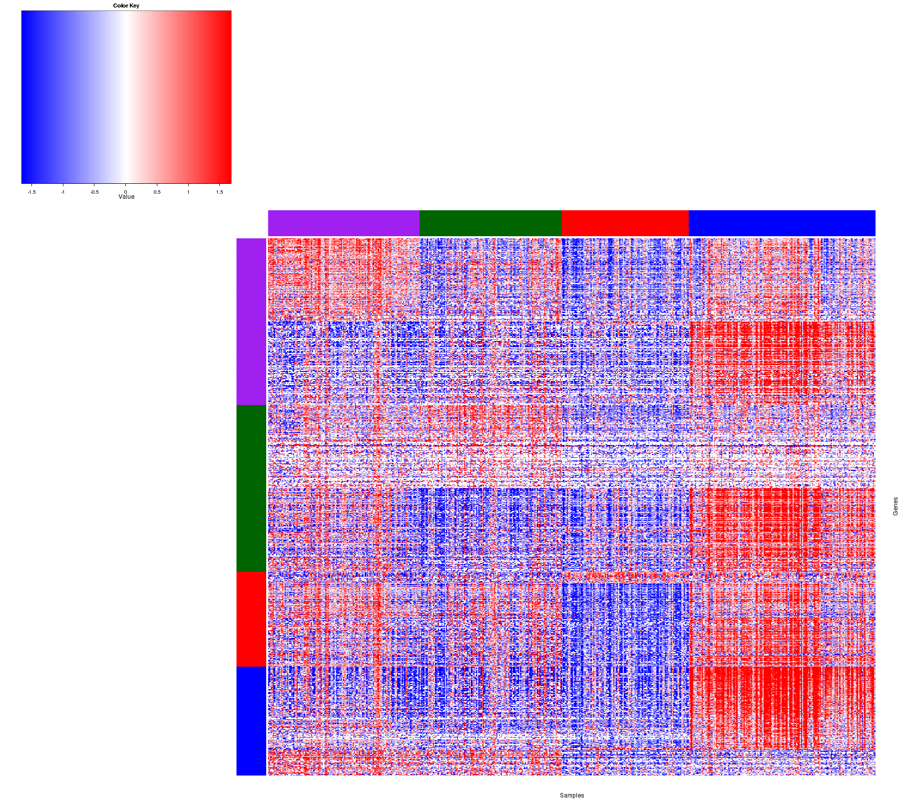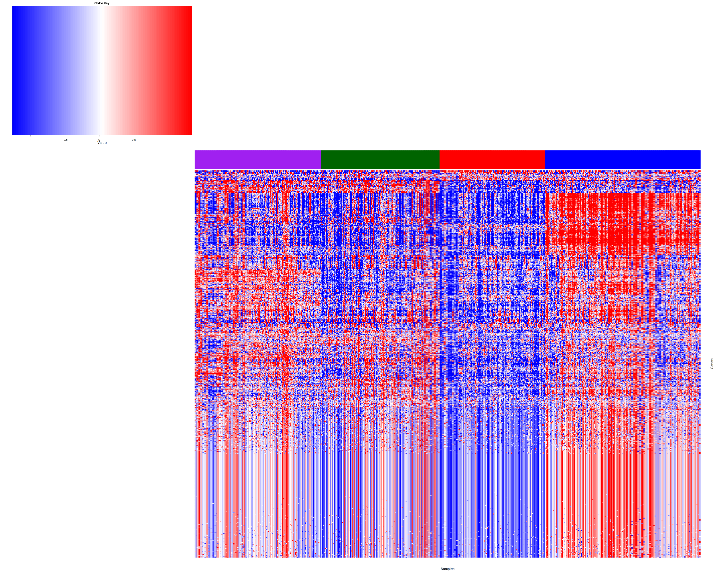 Figure 1. Get High-res Image Samples were separated into 4 clusters. Shown are 508 samples and 967 marker miRs. The color bar of the row indicates the marker miRs for the corresponding cluster.