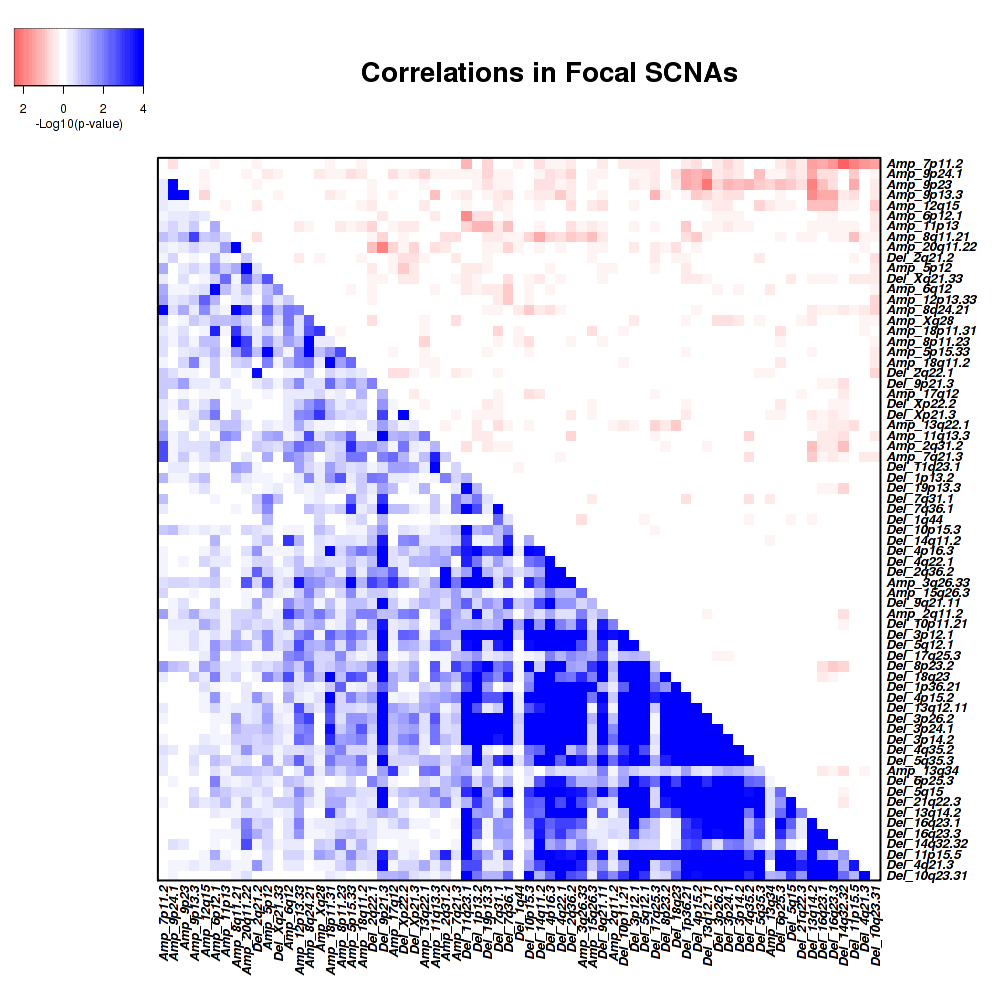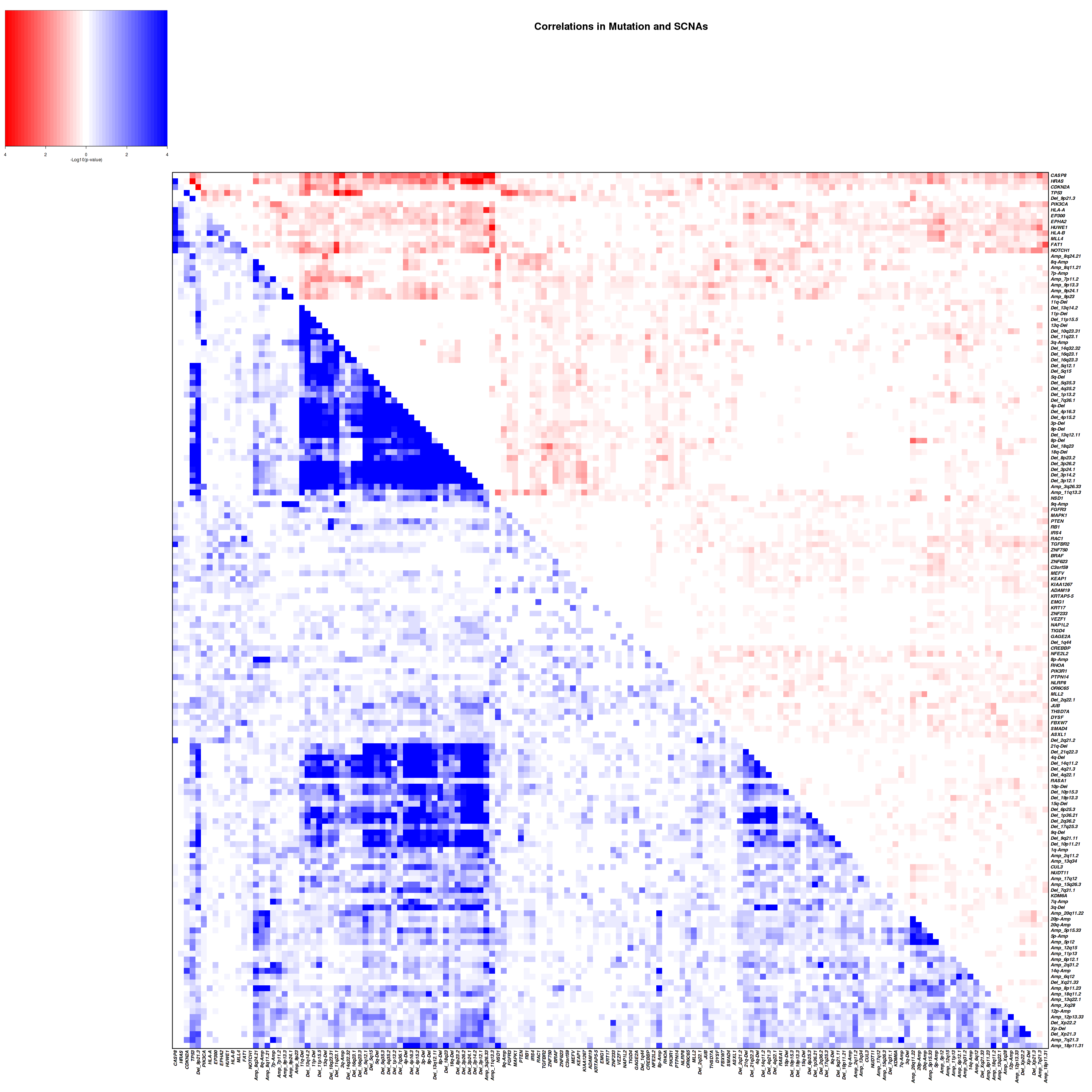Figure 4. Get High-res Image Co-occurring and mutually-exclusive pairs for all copy number and mutation events. Blue means two events are co-occurring and red means two events are mutually-exclusive.