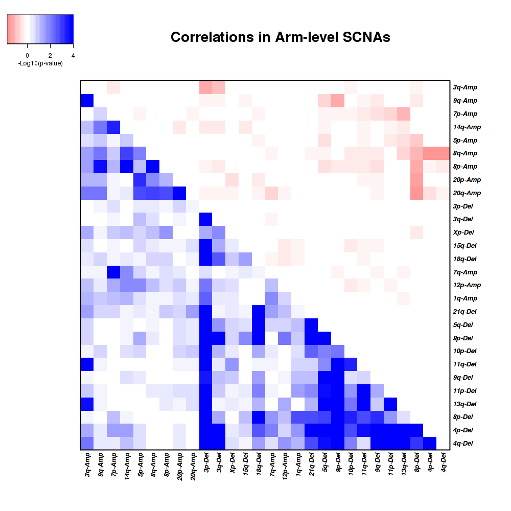 Figure 1. Get High-res Image Co-occurring and mutually-exclusive pairs for copy number variations of arm level events. Blue means two events are co-occurring and red means two events are mutually-exclusive.