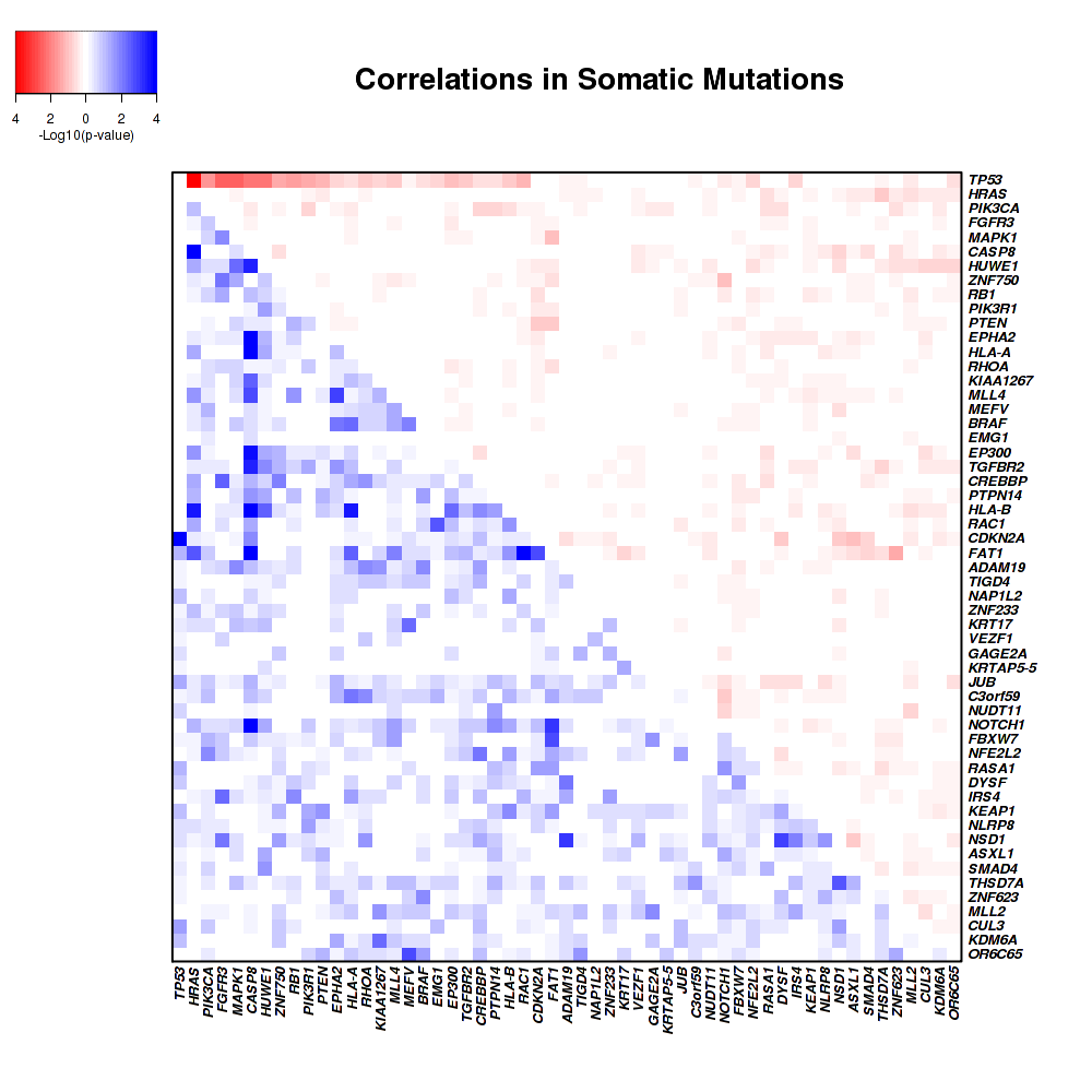 Figure 3. Get High-res Image Co-occurring and mutually-exclusive pairs for significantly mutated genes. Blue means two events are co-occurring and red means two events are mutually-exclusive.