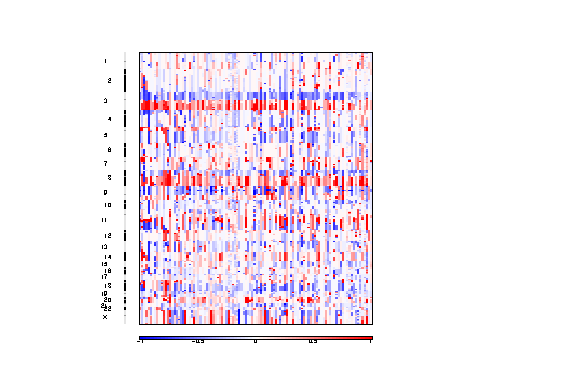 A table of chromosome arm amplification levels for each sample. Each row is a chromosome arm, and each column a sample. The data are in units of absolute copy number -2.