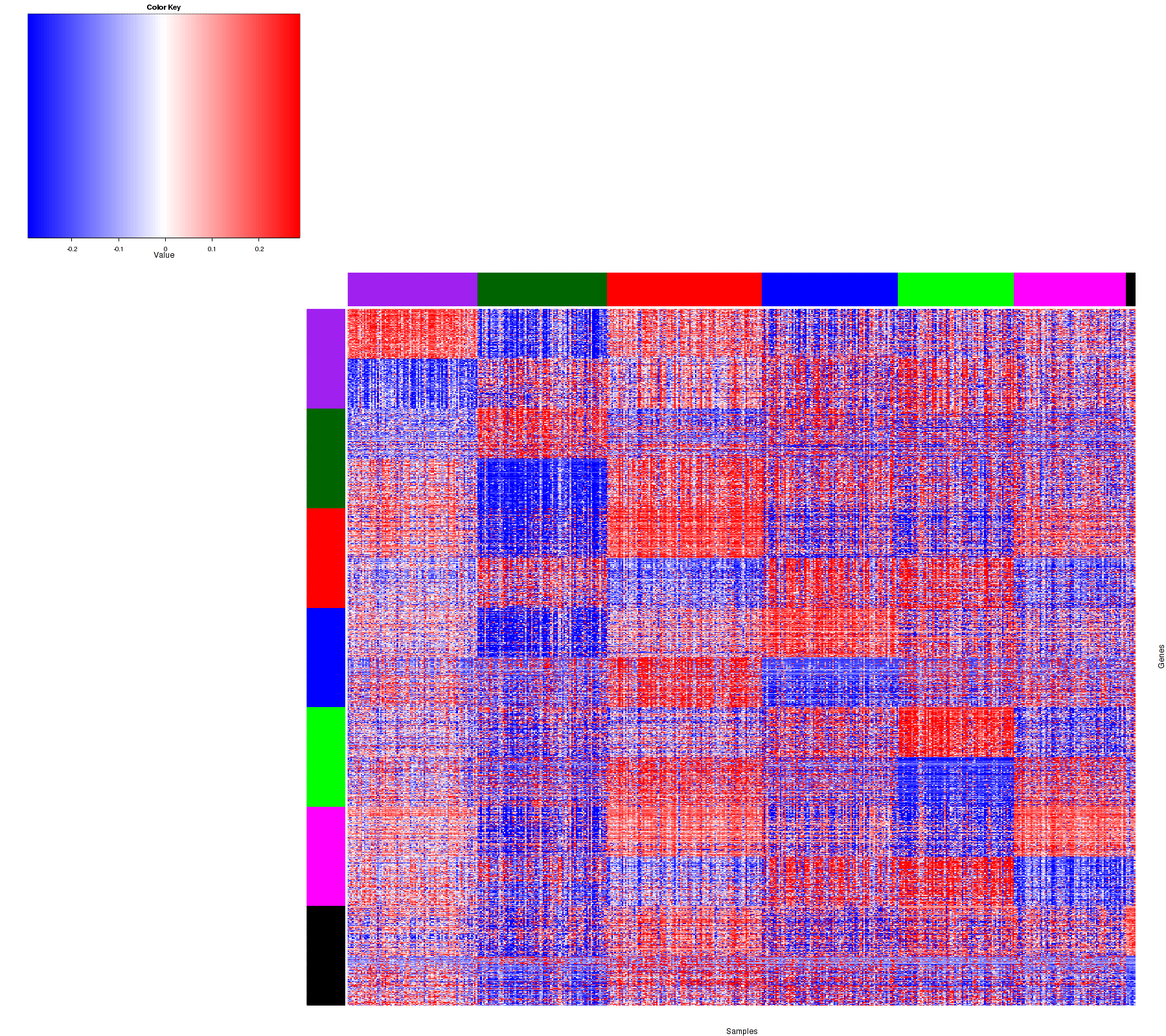 Figure 1. Get High-res Image Samples were separated into 7 clusters. Shown are 528 samples and 2100 marker genes. The color bar of the row indicates the marker genes for the corresponding cluster.