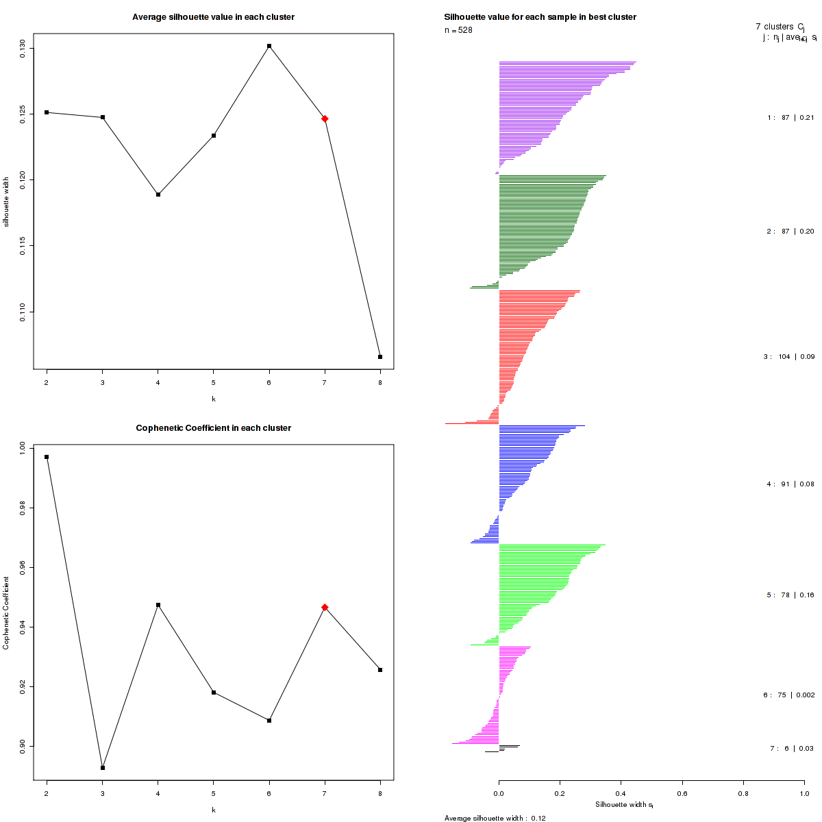 Figure 3. Get High-res Image The silhouette width was calculated for each sample and each value of k. The left upper panel shows the average silhouette width across all samples for each tested k (left upper panel). The left lower panel shows the Cophenetic Correlation Coefficients for each tested k. The right panel shows assignments of clusters to samples and the silhouette width of each sample for the most robust clustering.