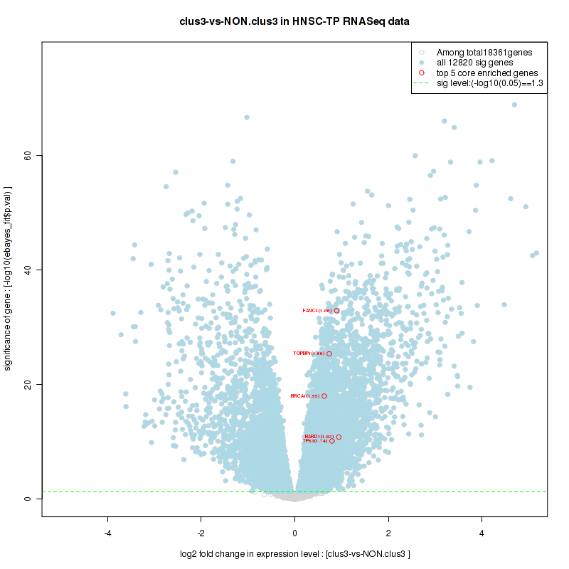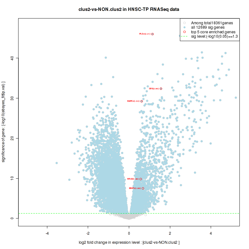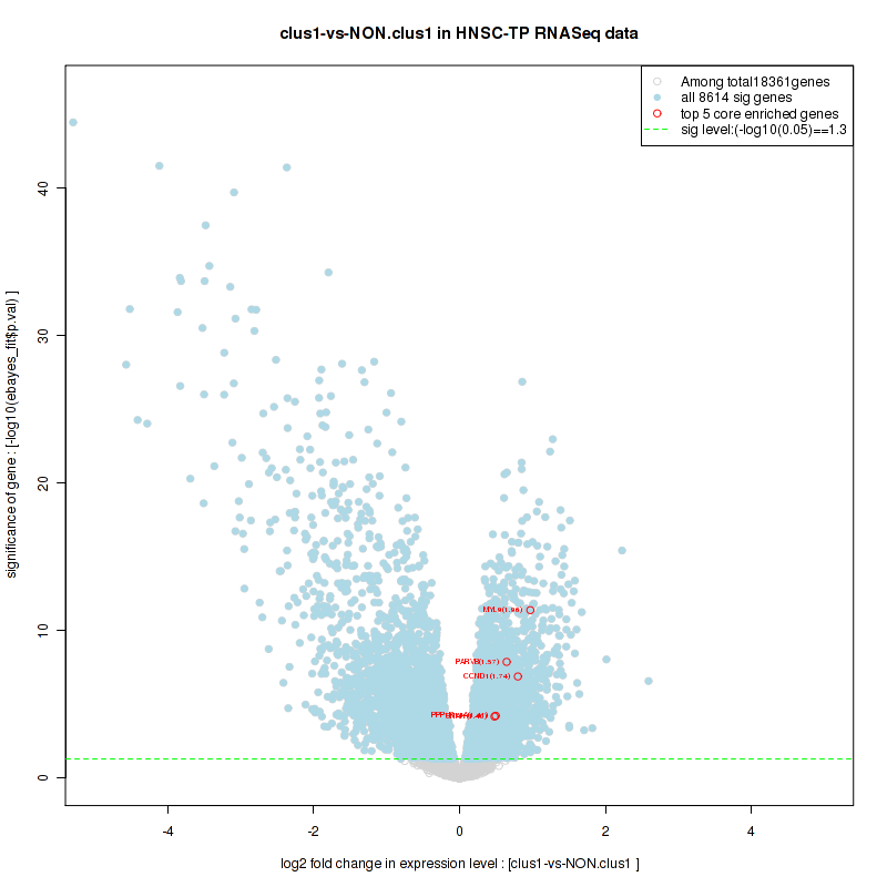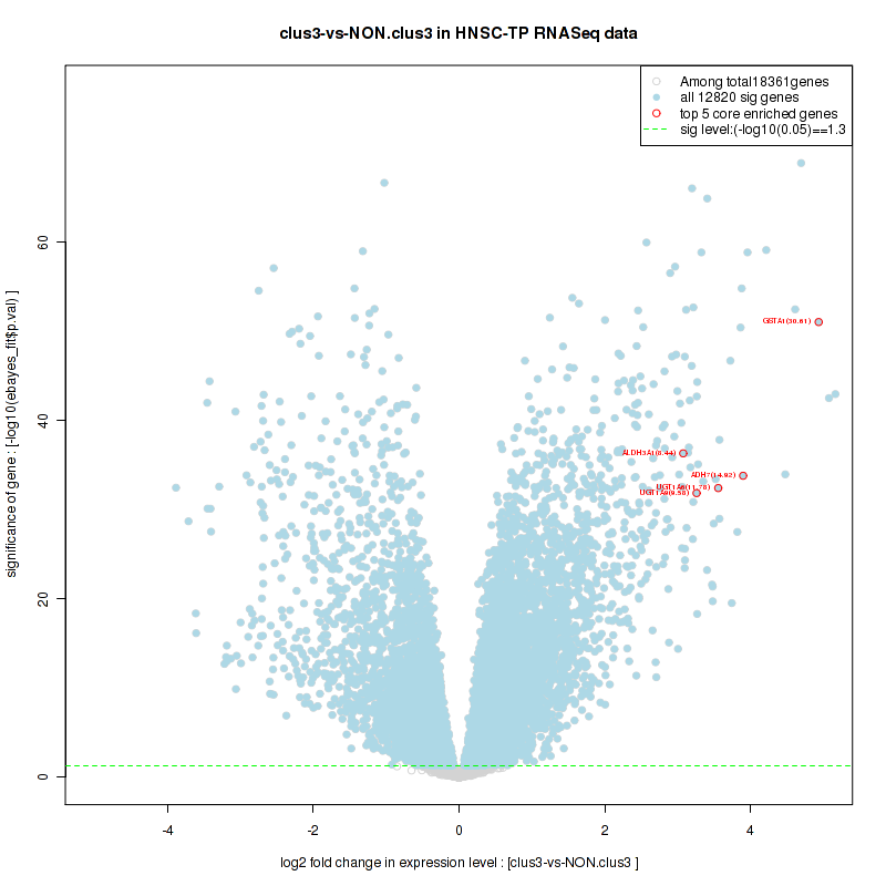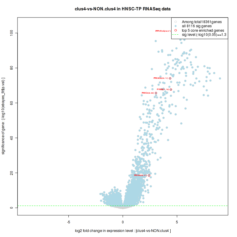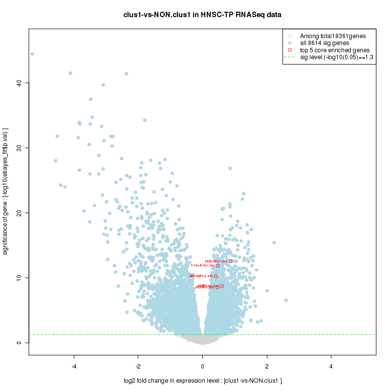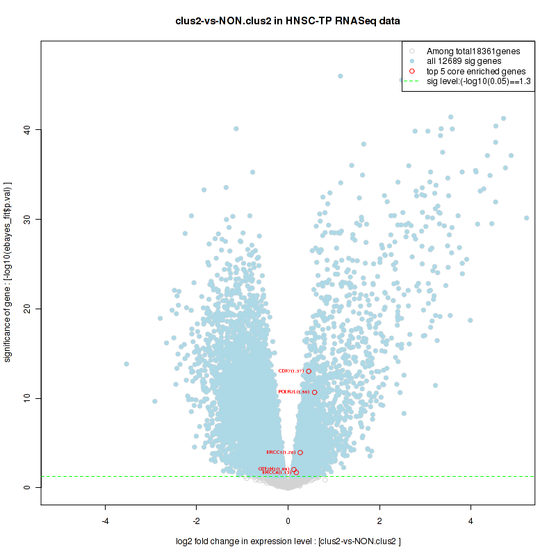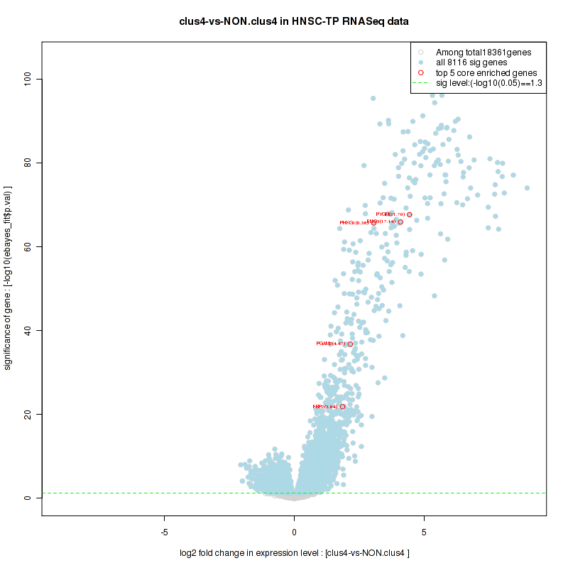 Figure S80. Get High-res Image For the top 5 core enriched genes in the pathway: KEGG RNA DEGRADATION, this volcano plot shows how much they are up/down-regulated and significant. The significance was calculated by empirical bayesian fit