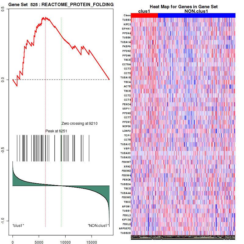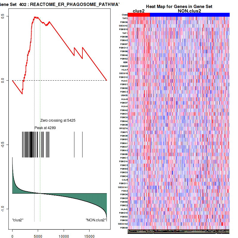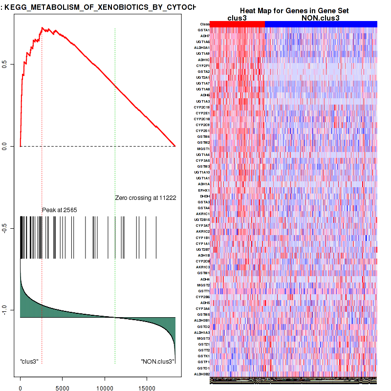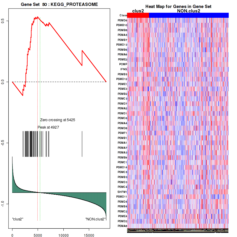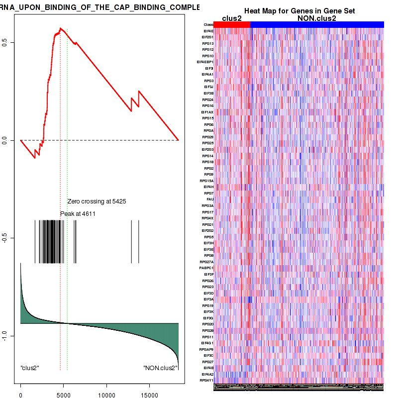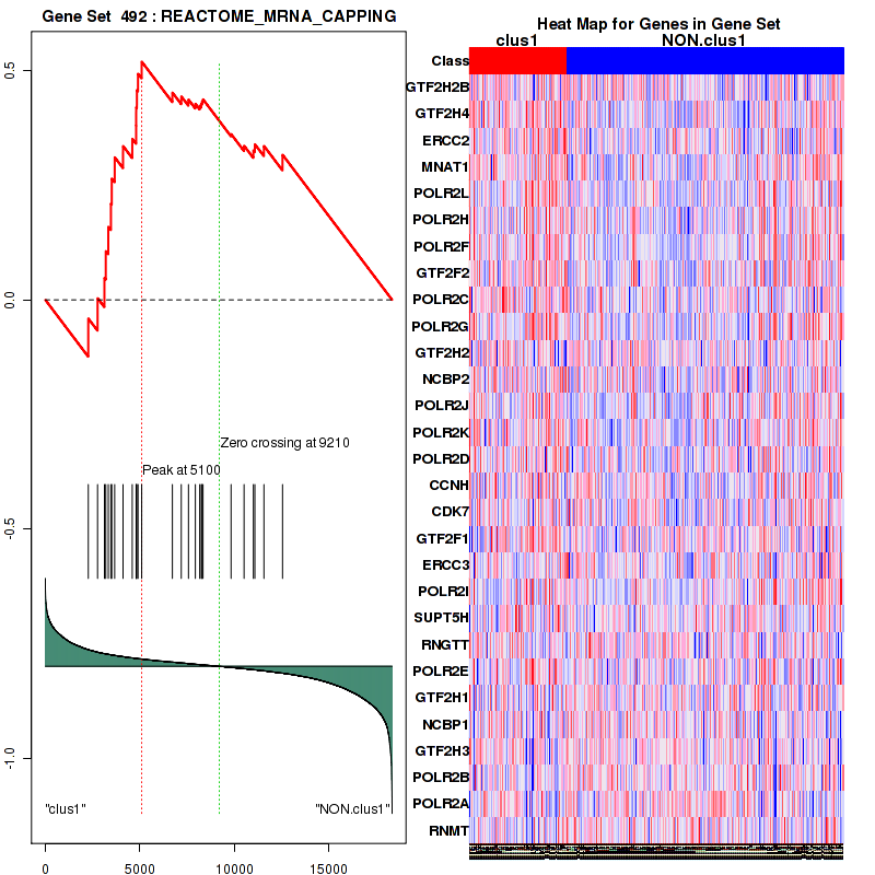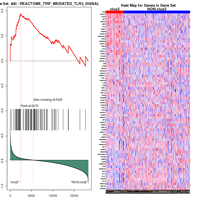 Table S1. Get Full Table This table shows a Running Enrichment Score (RES) of each gene in this pathway, that is, the enrichment score at this point in the ranked list of genes. All genes are ranked by Signal-to-Noise (S2N), a measure of similarity as default and are used to obtain ES matrix of all genes. In this way, GSEA tool uses expression pattern of not only overlapped genes but also not-overlapped genes to produce ES matrix.