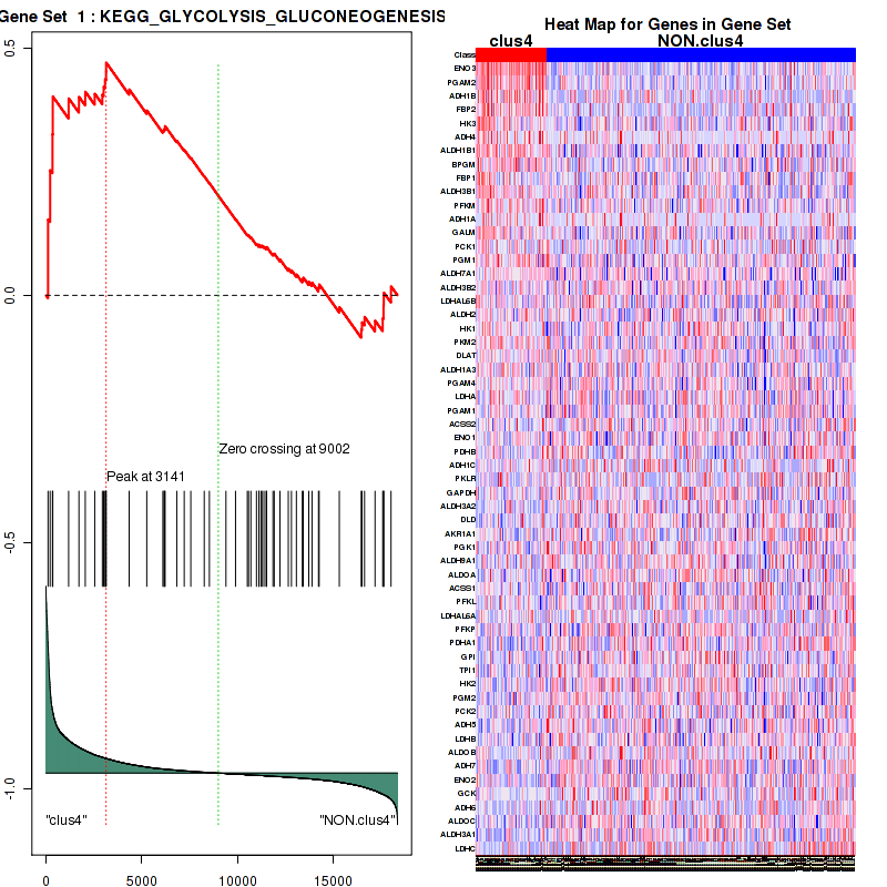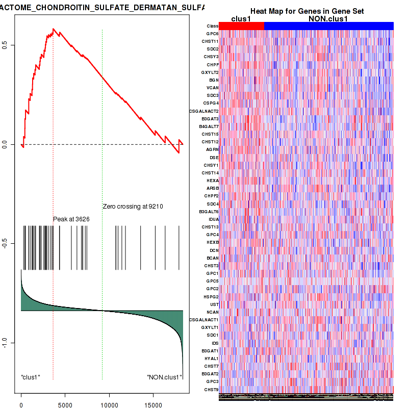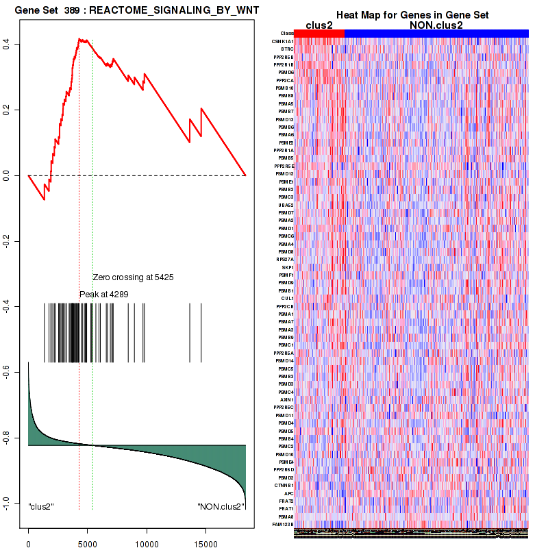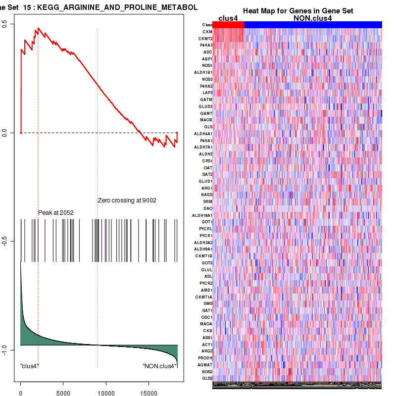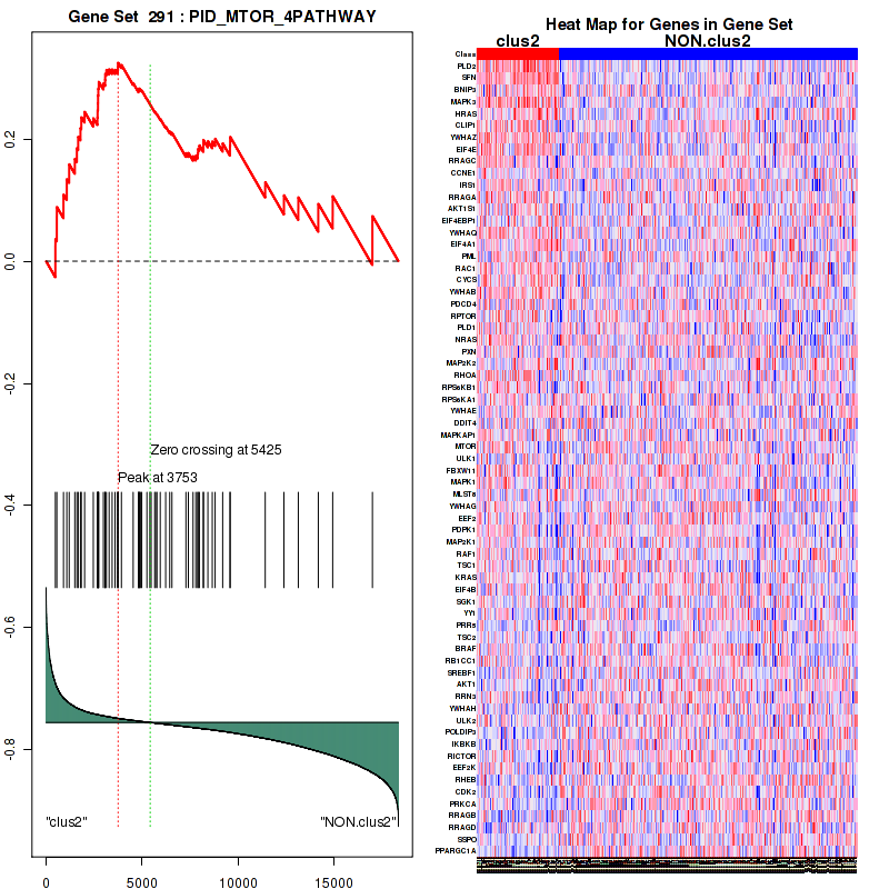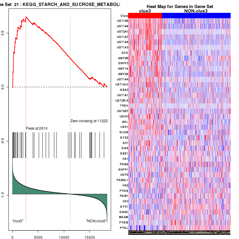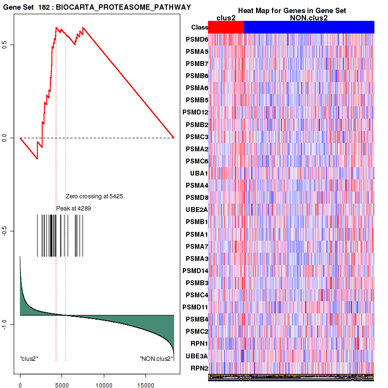 Table S1. Get Full Table This table shows a Running Enrichment Score (RES) of each gene in this pathway, that is, the enrichment score at this point in the ranked list of genes. All genes are ranked by Signal-to-Noise (S2N), a measure of similarity as default and are used to obtain ES matrix of all genes. In this way, GSEA tool uses expression pattern of not only overlapped genes but also not-overlapped genes to produce ES matrix.