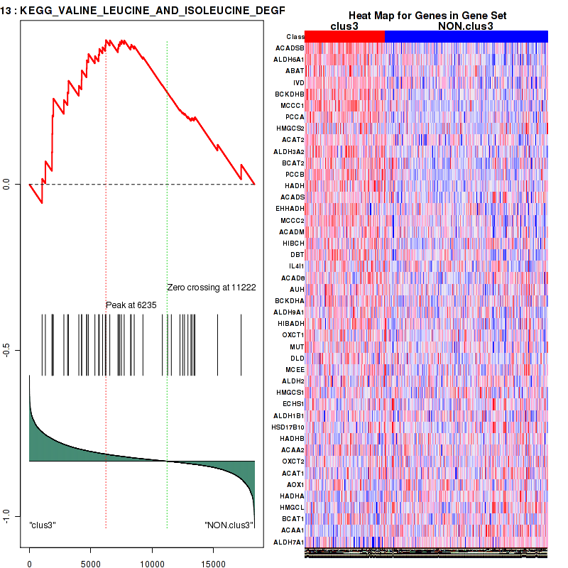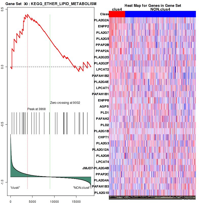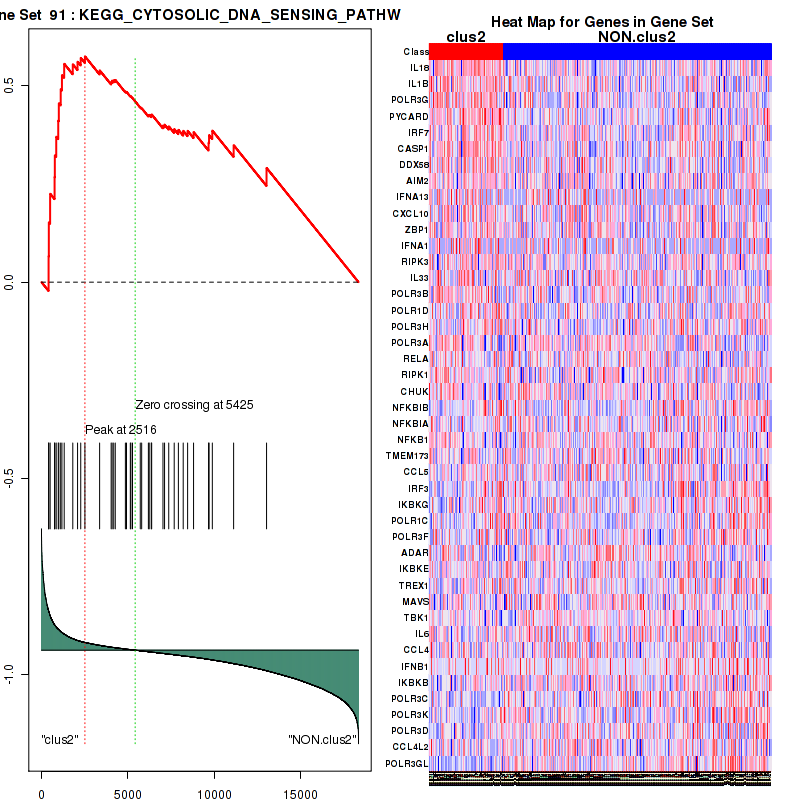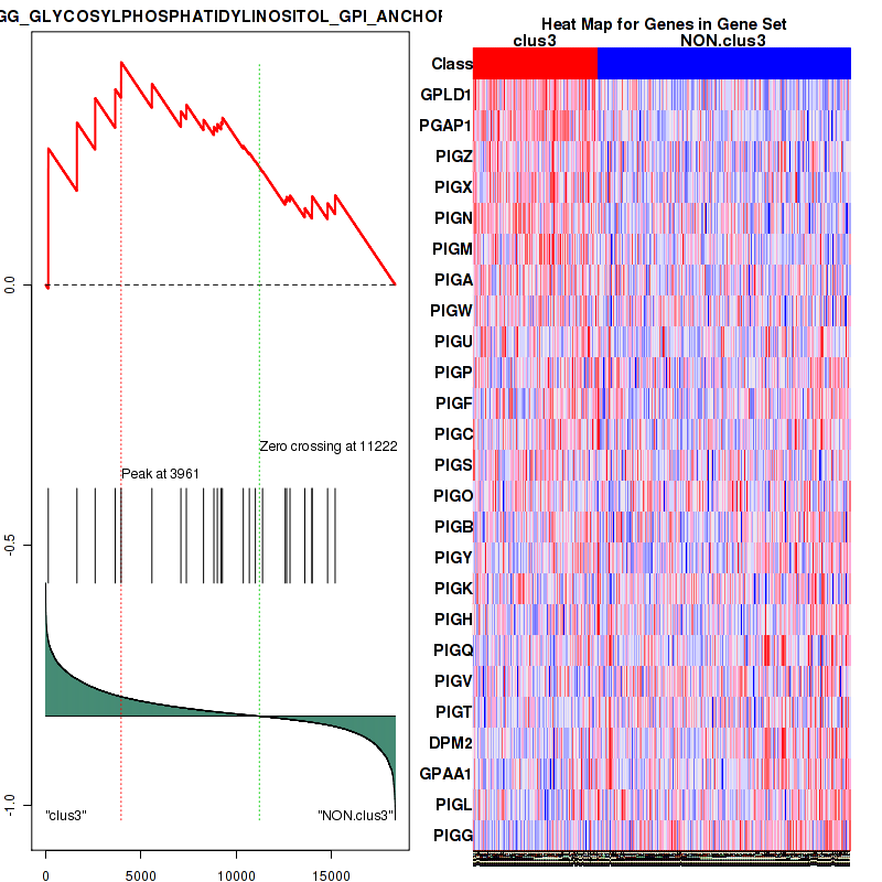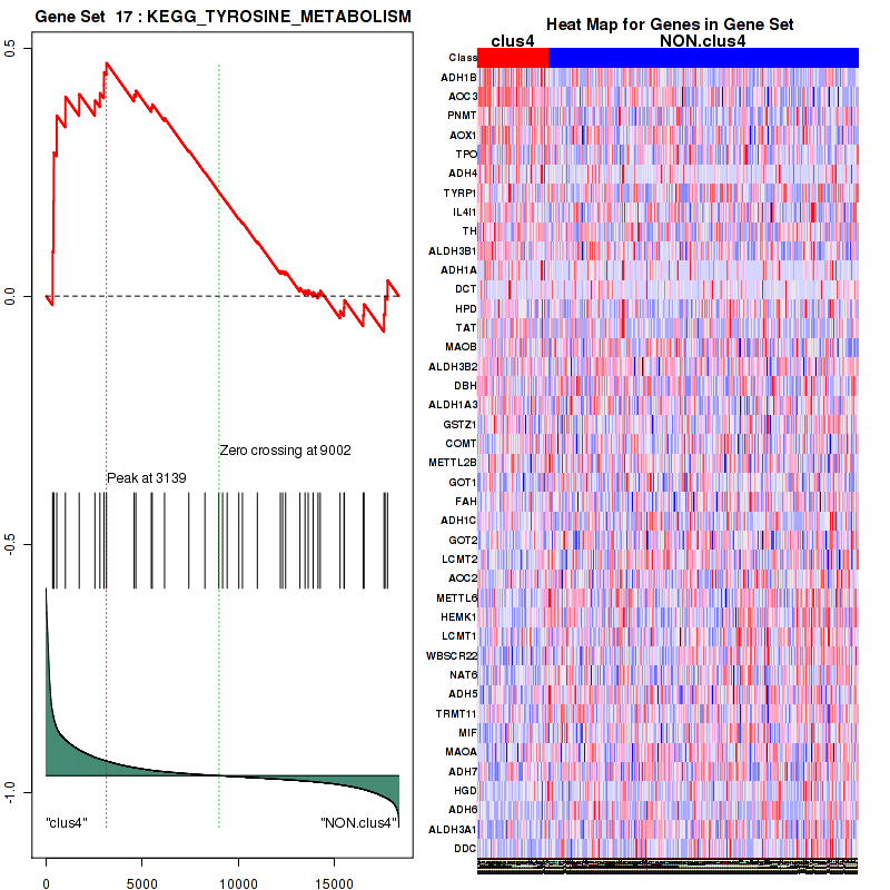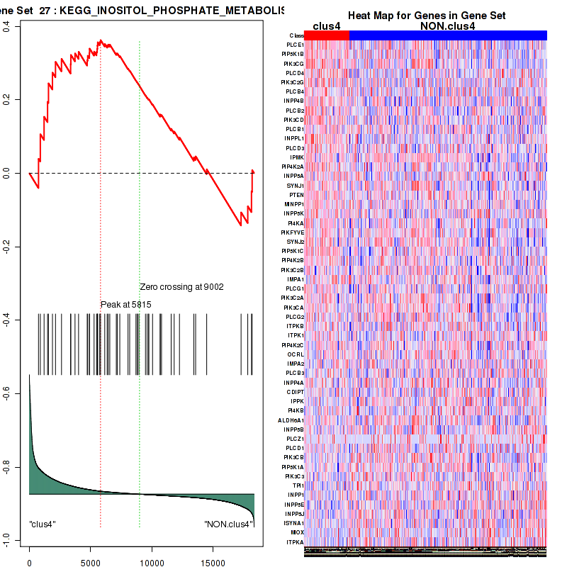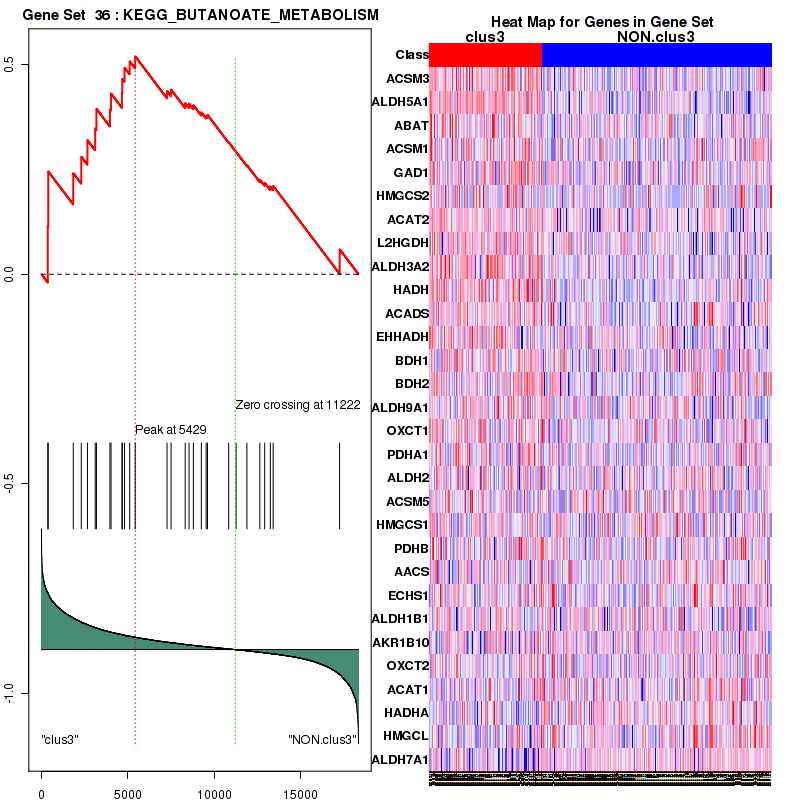 Table S1. Get Full Table This table shows a Running Enrichment Score (RES) of each gene in this pathway, that is, the enrichment score at this point in the ranked list of genes. All genes are ranked by Signal-to-Noise (S2N), a measure of similarity as default and are used to obtain ES matrix of all genes. In this way, GSEA tool uses expression pattern of not only overlapped genes but also not-overlapped genes to produce ES matrix.