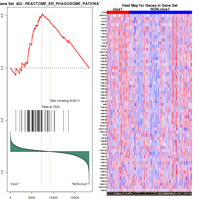 Table 3. Get Full Table This table shows top 10 pathways which are significantly enriched in cluster clus1. It displays only significant gene sets satisfying nom.p.val.threshold (-1), fwer.p.val.threshold (-1) , fdr.q.val.threshold (0.25) and the default table is sorted by Normalized Enrichment Score (NES). Further details on NES statistics, please visit The Broad GSEA website.