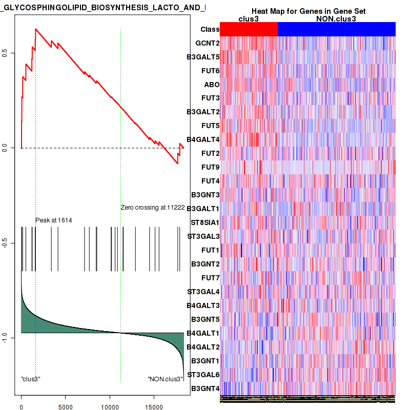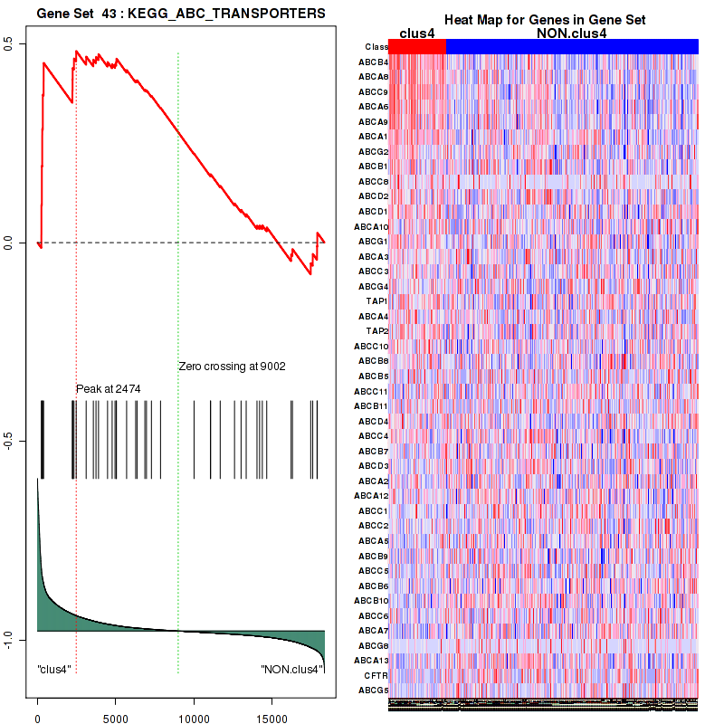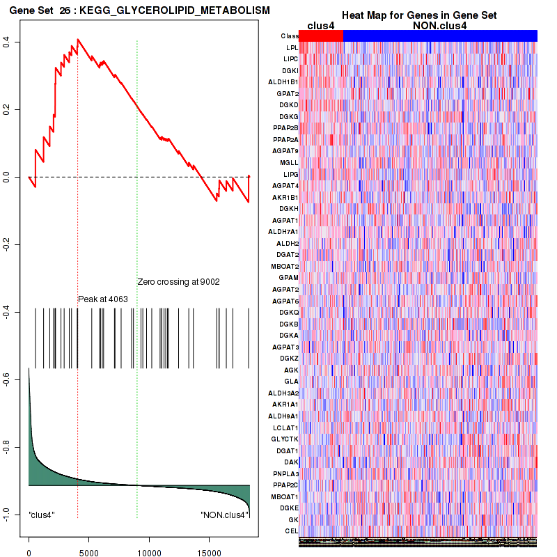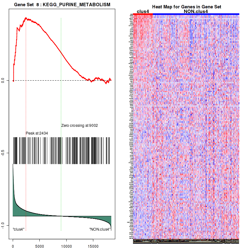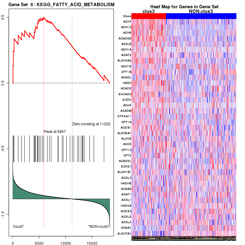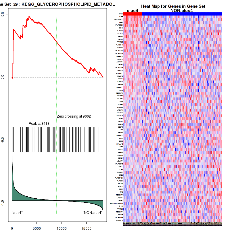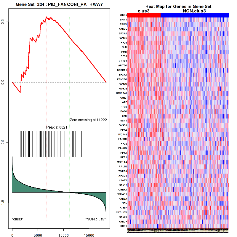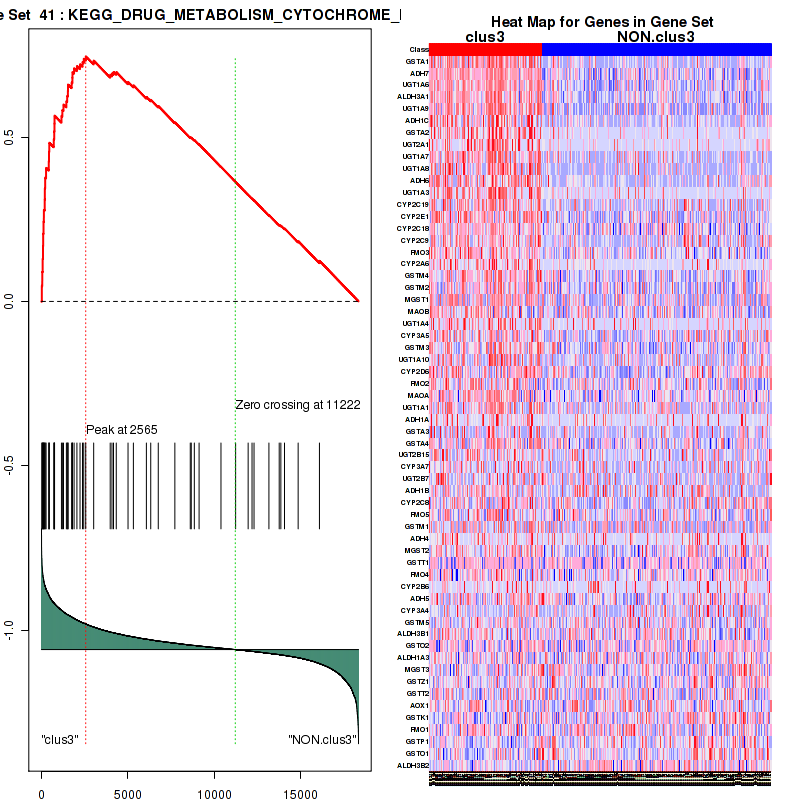 For the expression subtypes of 18378 genes in 521 samples, GSEA found enriched gene sets in each cluster using 520 gene sets in MSigDB canonical pathways. Top enriched gene sets are listed as below.