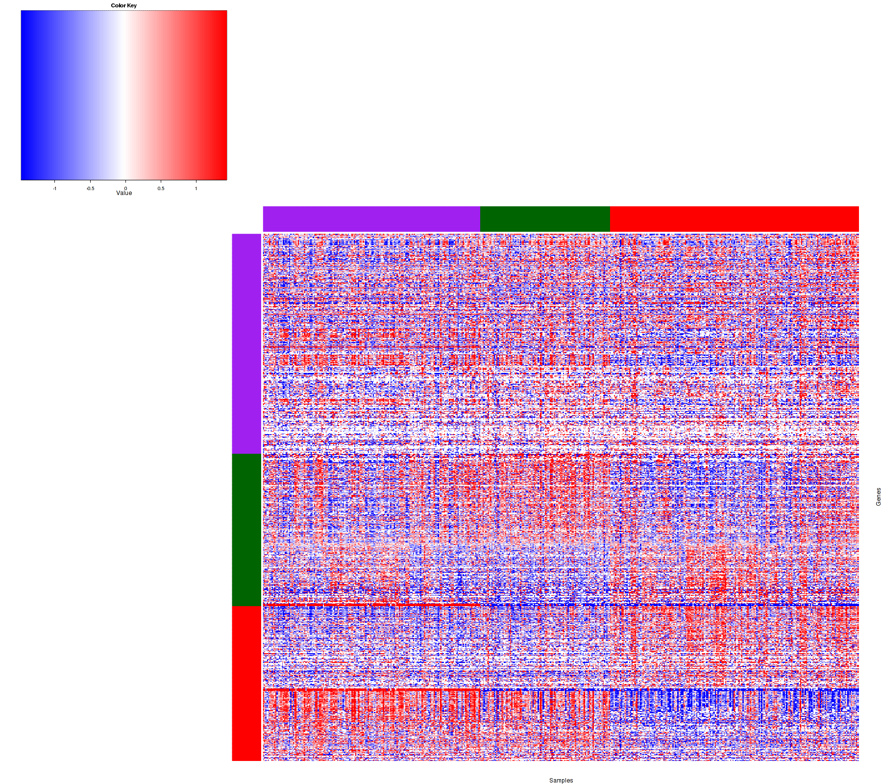 Figure 1. Get High-res Image Samples were separated into 3 clusters. Shown are 477 samples and 955 marker miRs. The color bar of the row indicates the marker miRs for the corresponding cluster.