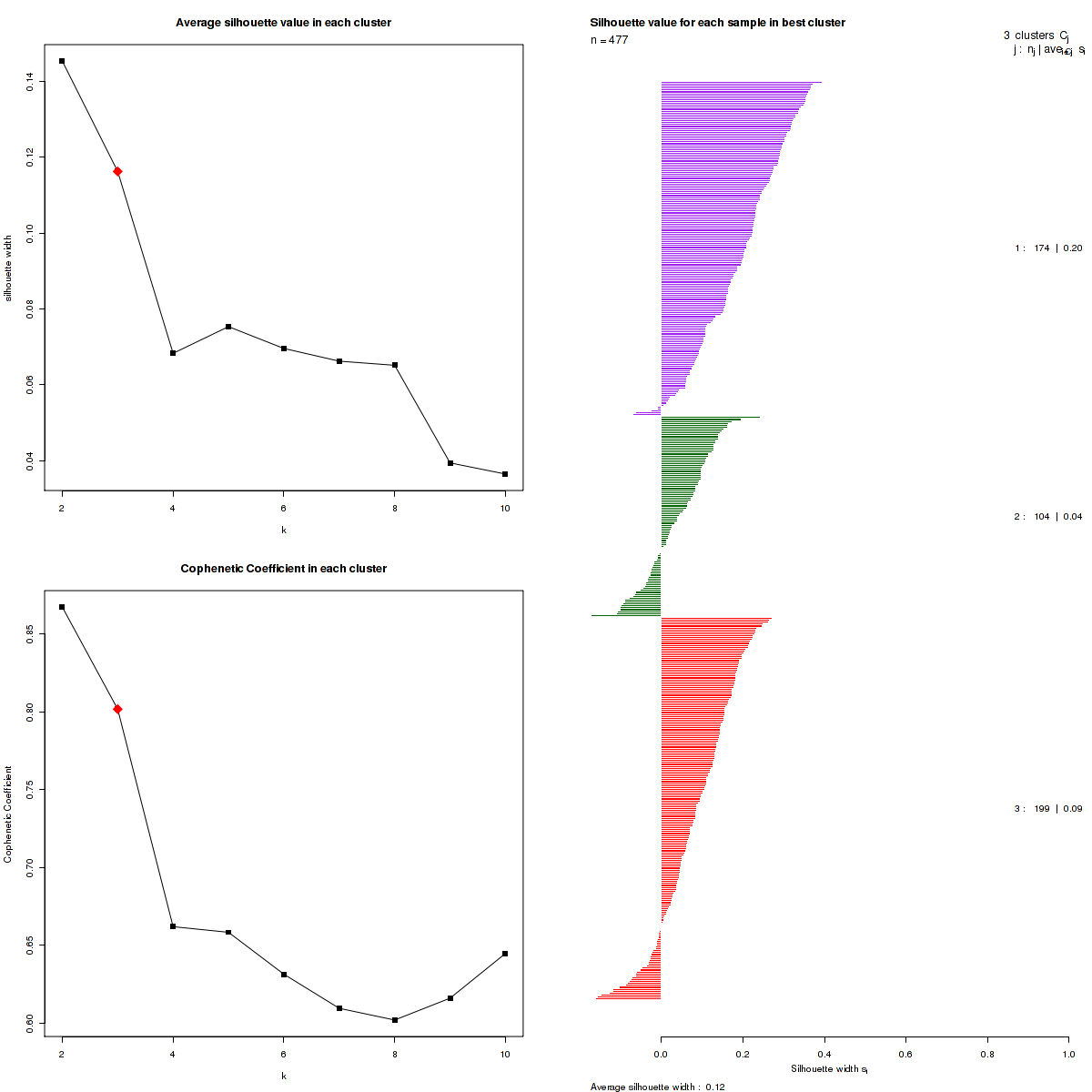The cophenetic correlation coefficients and average silhouette values are used to determine the k with the most robust clusterings. From the plot of cophenetic correlation versus k, we select modes and the the point preceding the greatest decrease in cophenetic correlation coefficient, and from these choose the k with the highest average silhouette value.