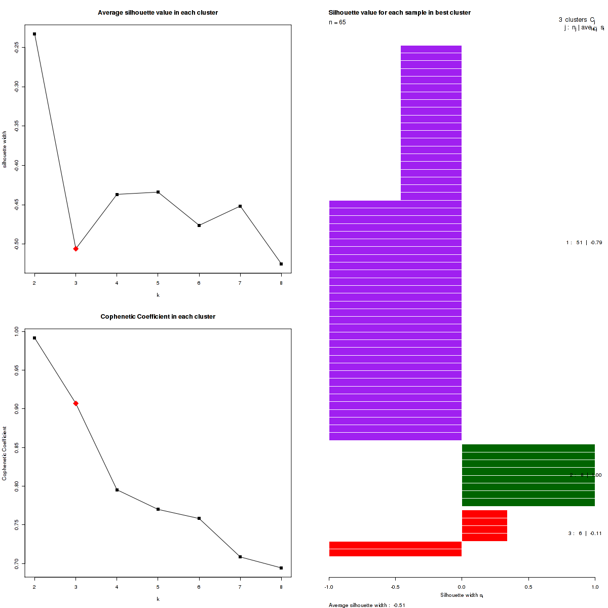 Figure 3. Get High-res Image The silhouette width was calculated for each sample and each value of k. The left panel shows the average silhouette width across all samples for each tested k (left panel). The right panels shows assignments of clusters to samples and the silhouette width of each sample for the most robust clustering.