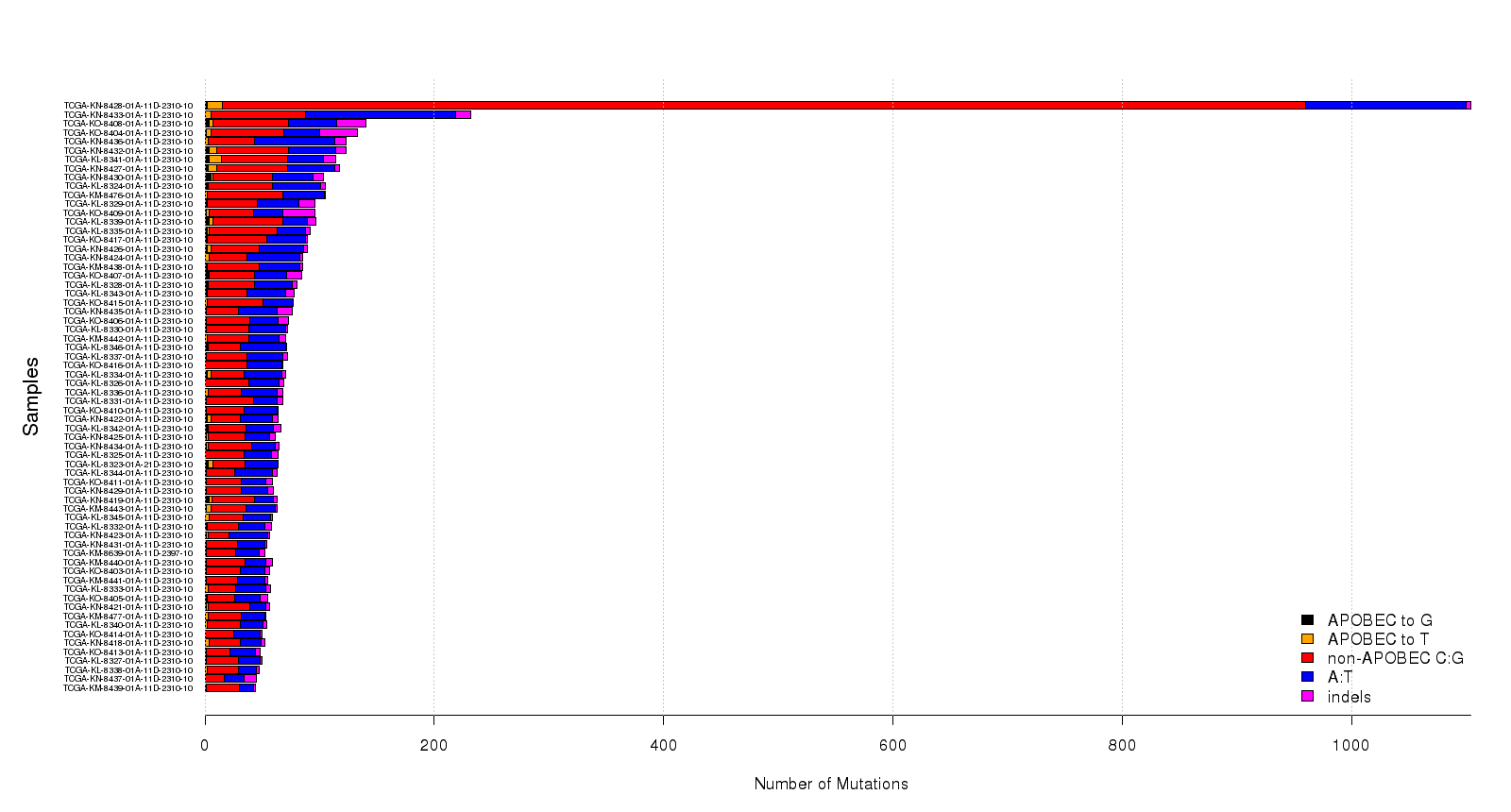 Figure 4. Get High-res Image Numbers of APOBEC and non-APOBEC mutations (X-axis) in each sample (Y-axis). All values are calculated based on the values in the columns “indels”, “substitutions”, and columns containing individual substitution types in the “*_sorted_sum_all_fisher_Pcorr.txt” file. “APOBEC to G” – number of tCw→tGw mutations; “APOBEC to T” – number of tCw→tTw mutations; “non-APOBEC C:G” – number of mutations in C:G base pairs not conforming to the APOBEC signature (= total of tCw→tAw plus all mutations in C not occurring in the tCw motif); “A:T” –- all mutations in A:T base pairs; “indels” – all indels. All counts include complementary mutations. Samples are ordered by total mutation counts in the descending order. Since only base substitutions are shown, bars with excessive numbers of non-substitution mutations may be shorter than the two flanking bars.