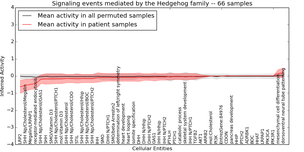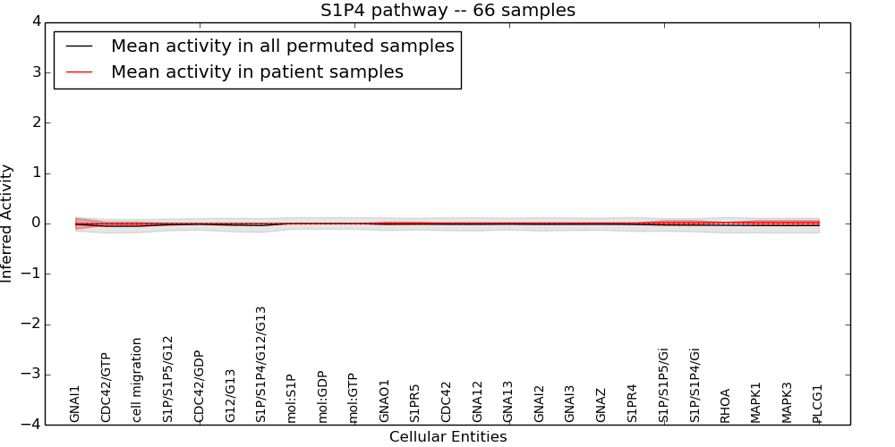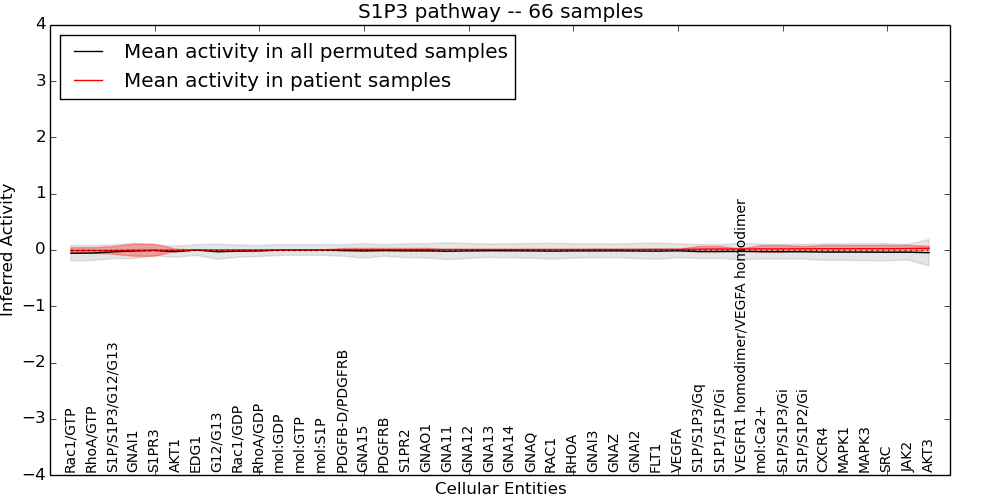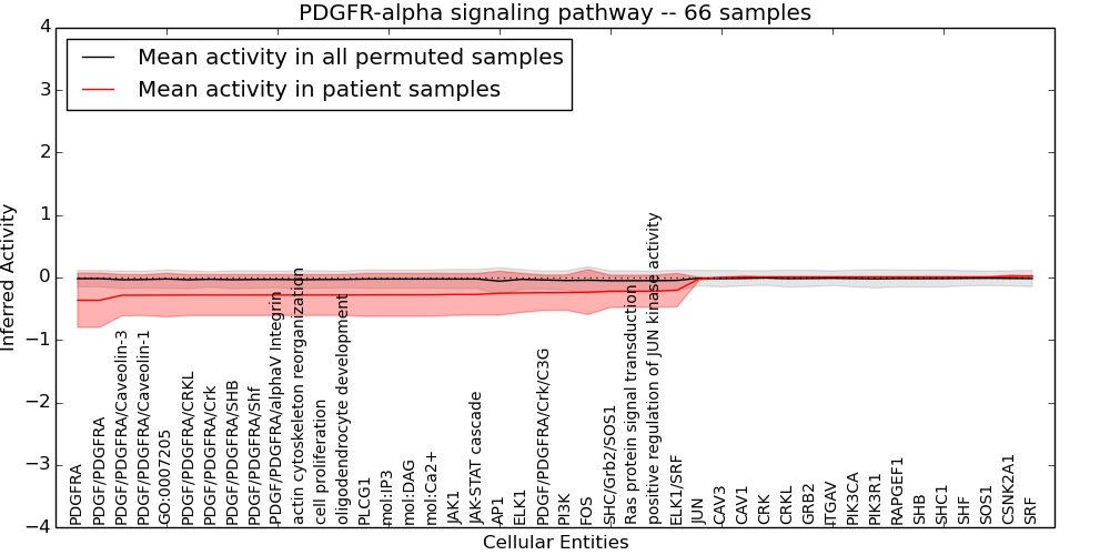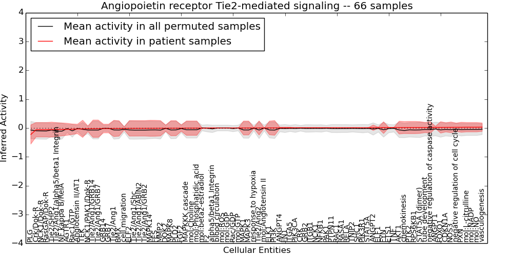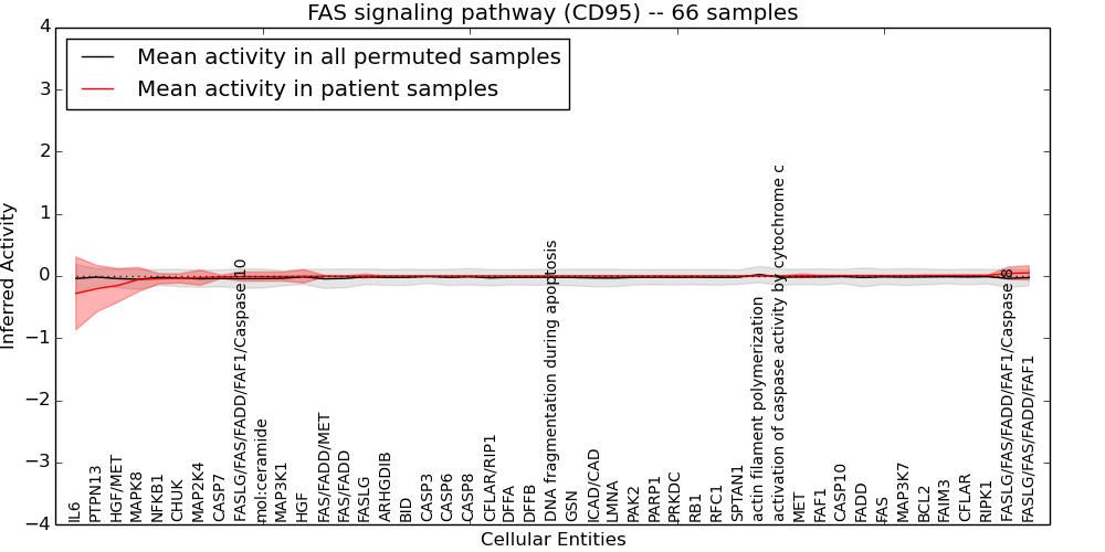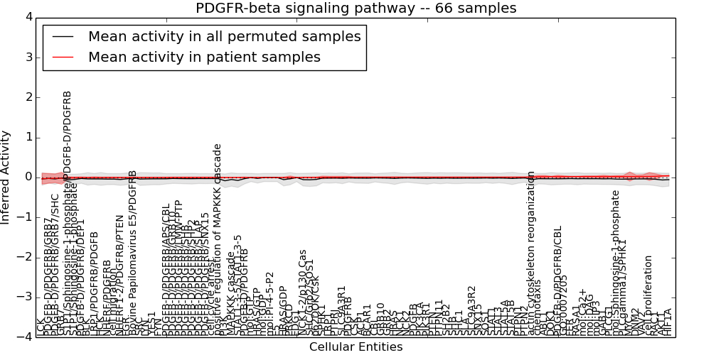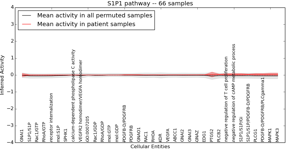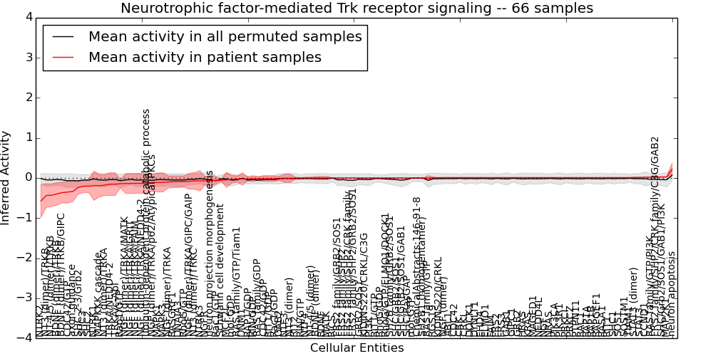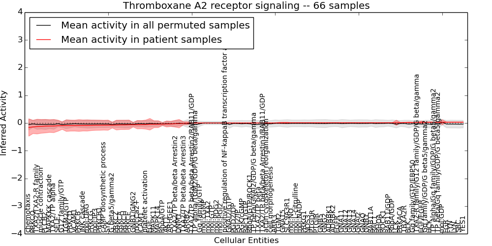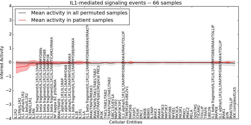 Figure S131. Get High-res Image This plot shows pathway concept perturbations across all samples against a permutation model. The concepts along the x-axis are sorted by lowest to highest mean activity for the real patient samples. Mean inferred activities are plotted along the y-axis as a colored band showing the average level and one standard deviation range. Real samples are shown in red and permuted samples in black.