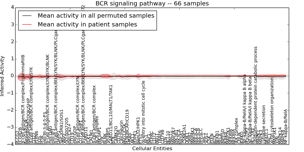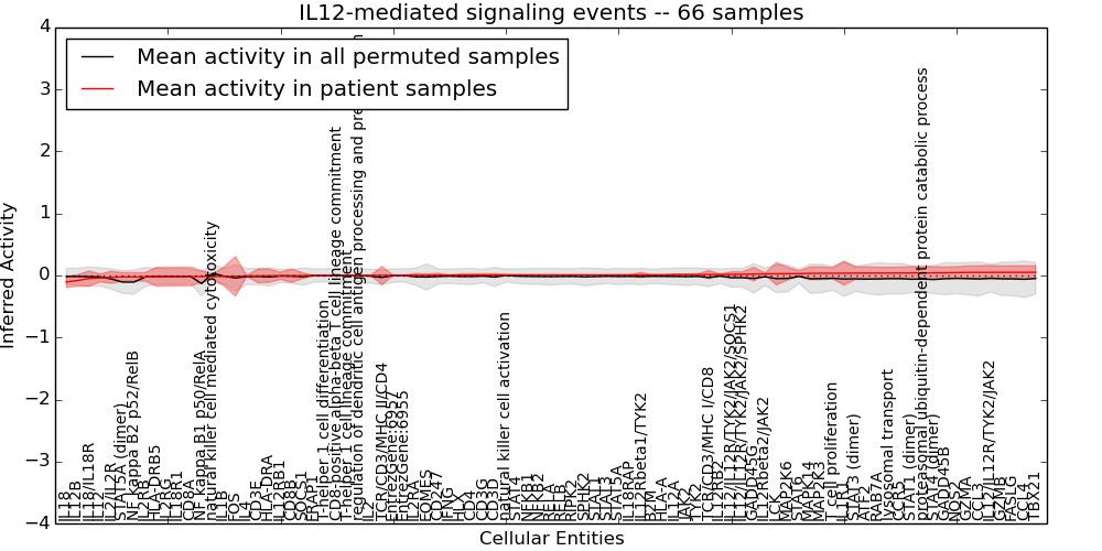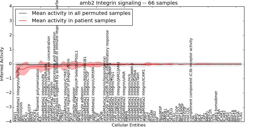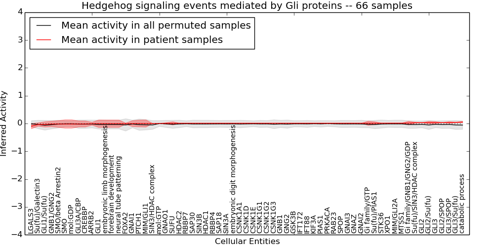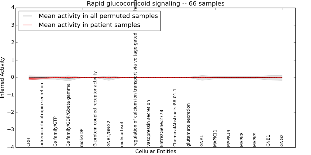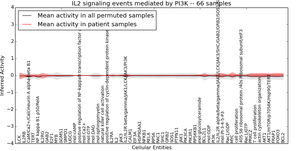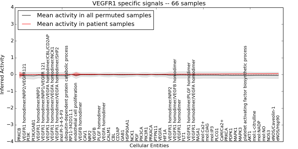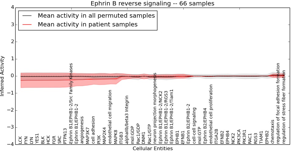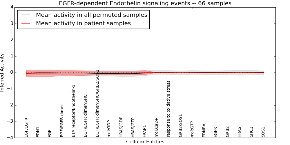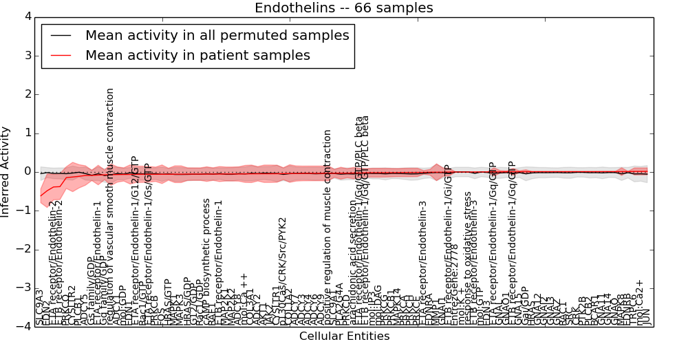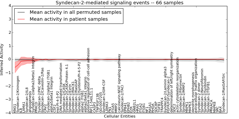 Figure S131. Get High-res Image This plot shows pathway concept perturbations across all samples against a permutation model. The concepts along the x-axis are sorted by lowest to highest mean activity for the real patient samples. Mean inferred activities are plotted along the y-axis as a colored band showing the average level and one standard deviation range. Real samples are shown in red and permuted samples in black.