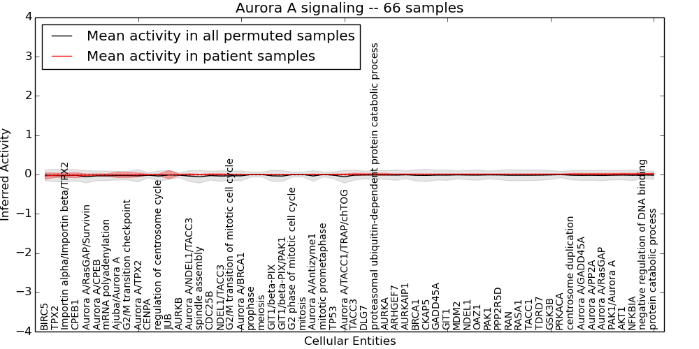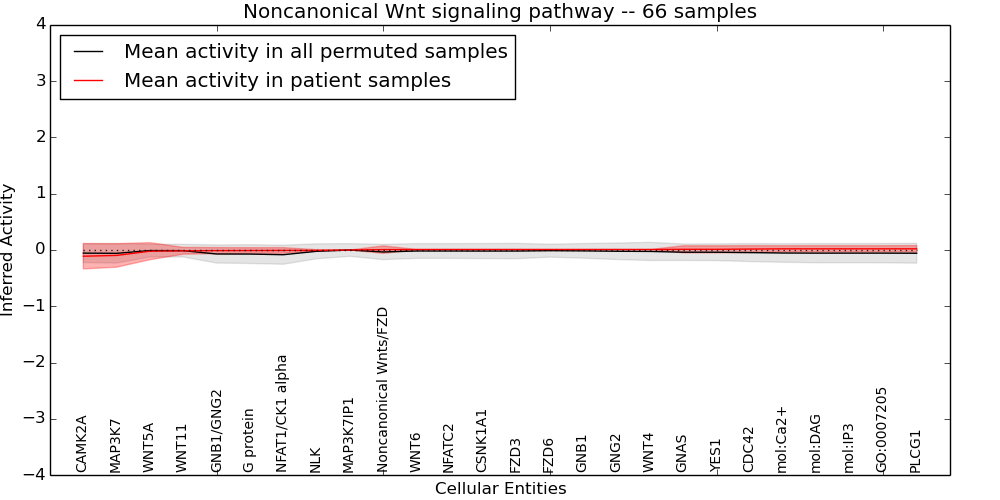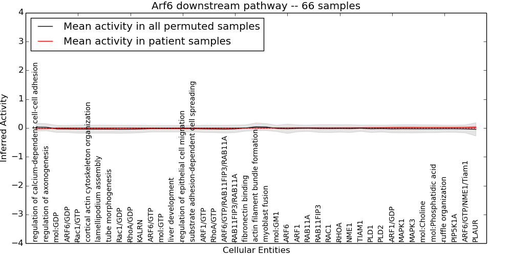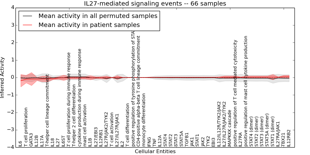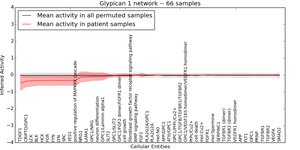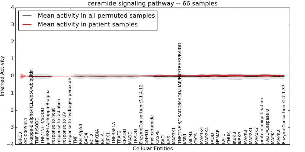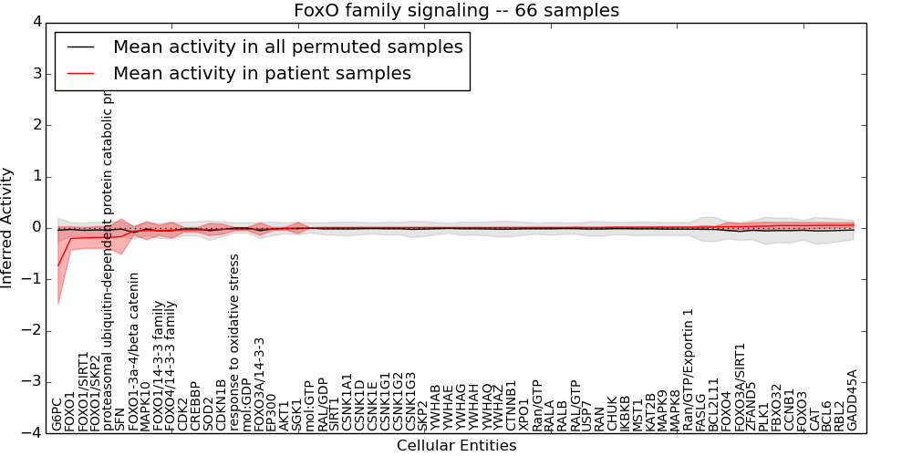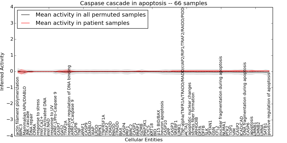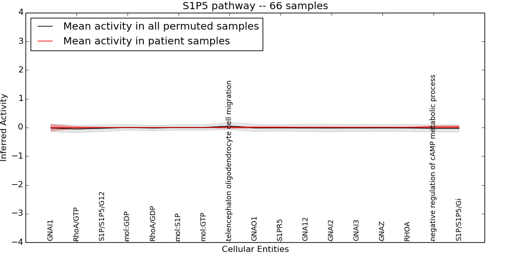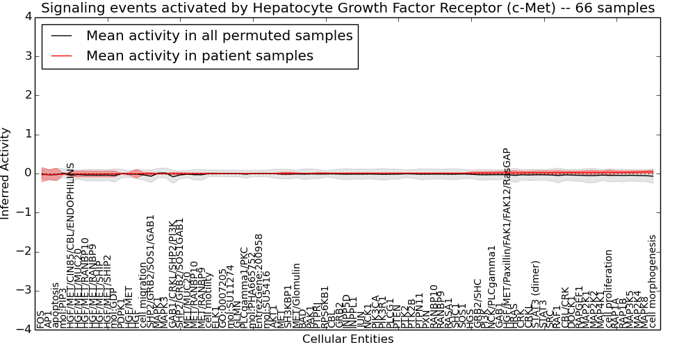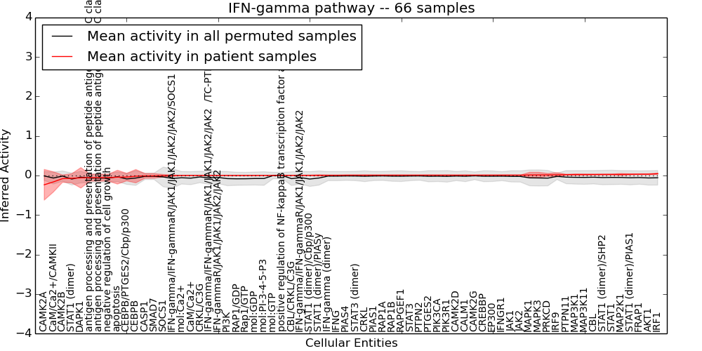 Figure S131. Get High-res Image This plot shows pathway concept perturbations across all samples against a permutation model. The concepts along the x-axis are sorted by lowest to highest mean activity for the real patient samples. Mean inferred activities are plotted along the y-axis as a colored band showing the average level and one standard deviation range. Real samples are shown in red and permuted samples in black.