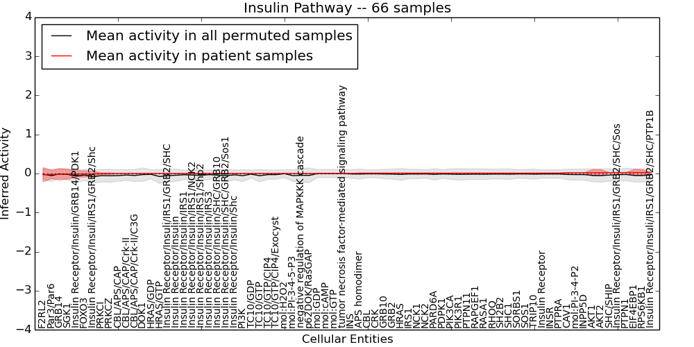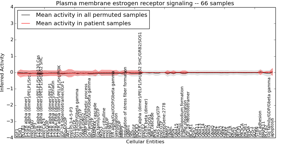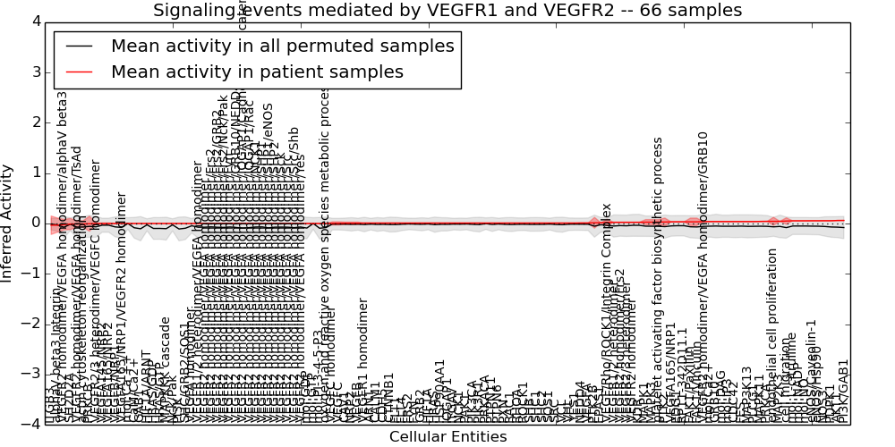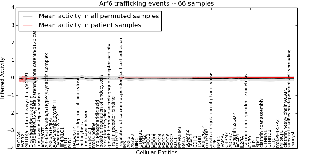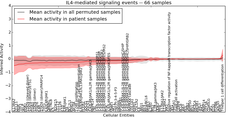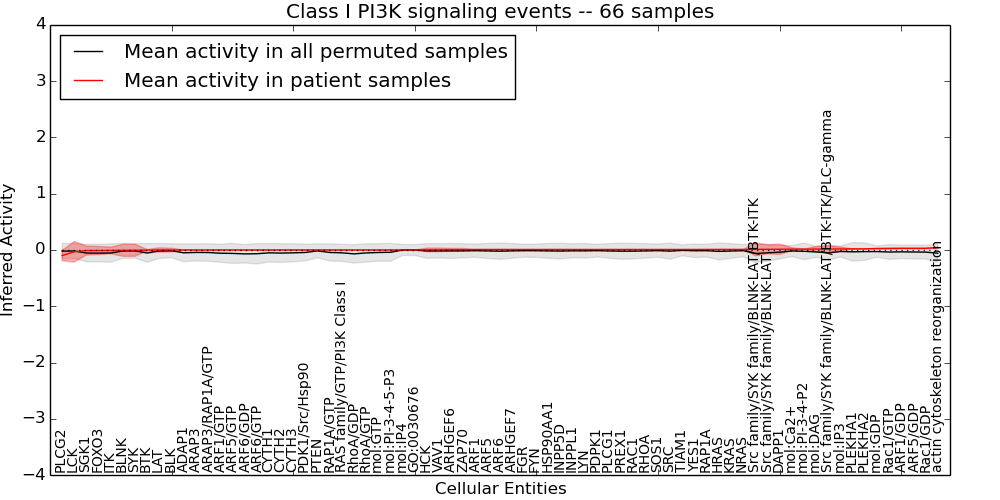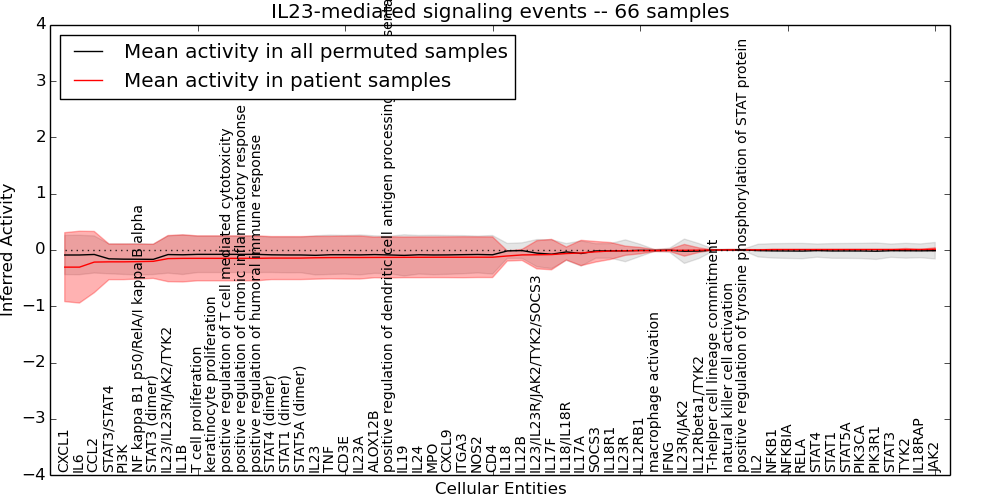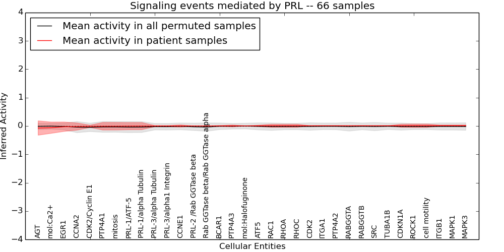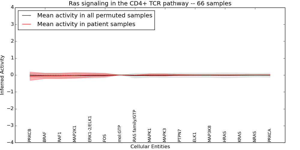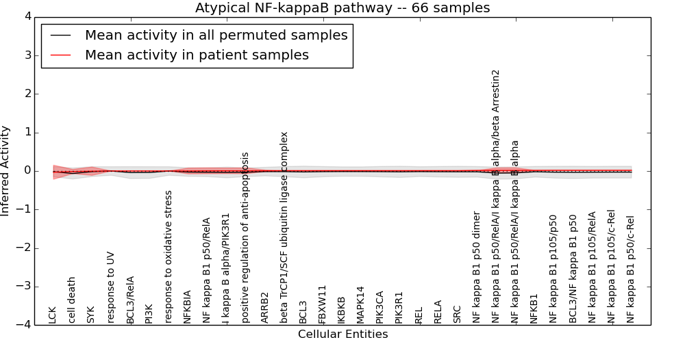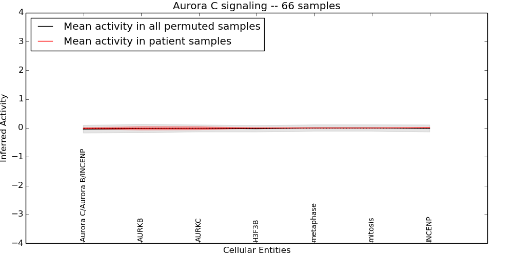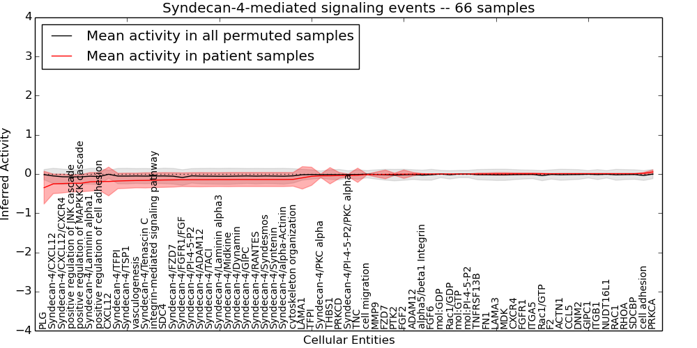 Figure S131. Get High-res Image This plot shows pathway concept perturbations across all samples against a permutation model. The concepts along the x-axis are sorted by lowest to highest mean activity for the real patient samples. Mean inferred activities are plotted along the y-axis as a colored band showing the average level and one standard deviation range. Real samples are shown in red and permuted samples in black.