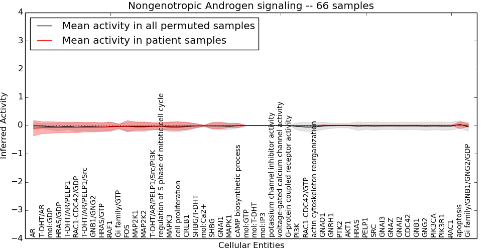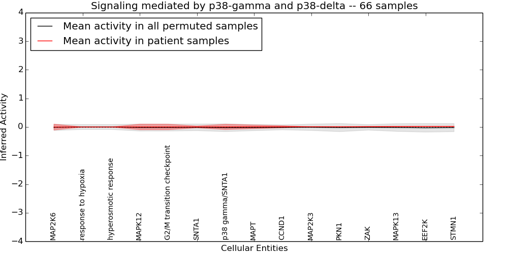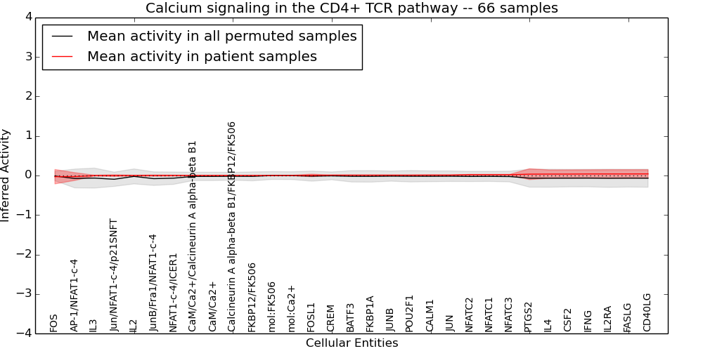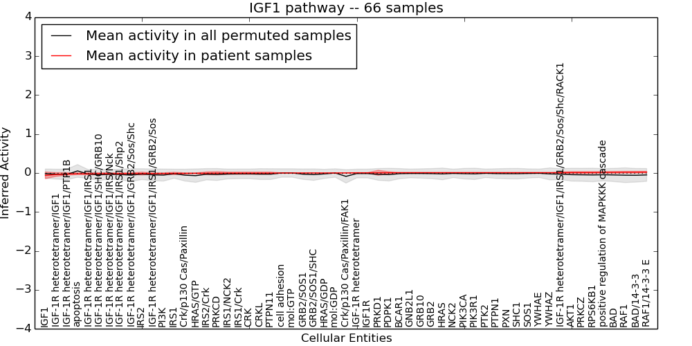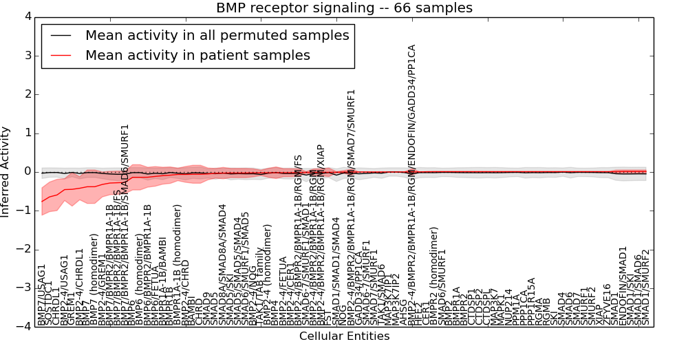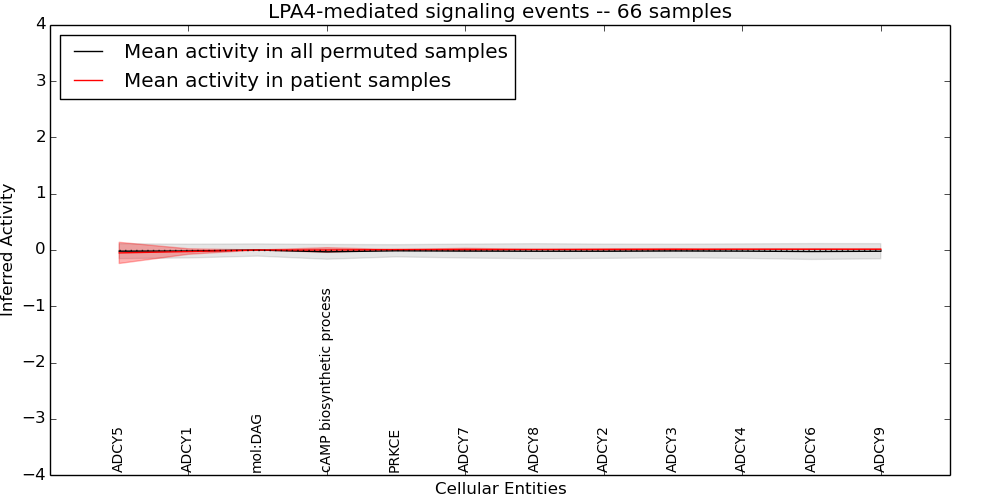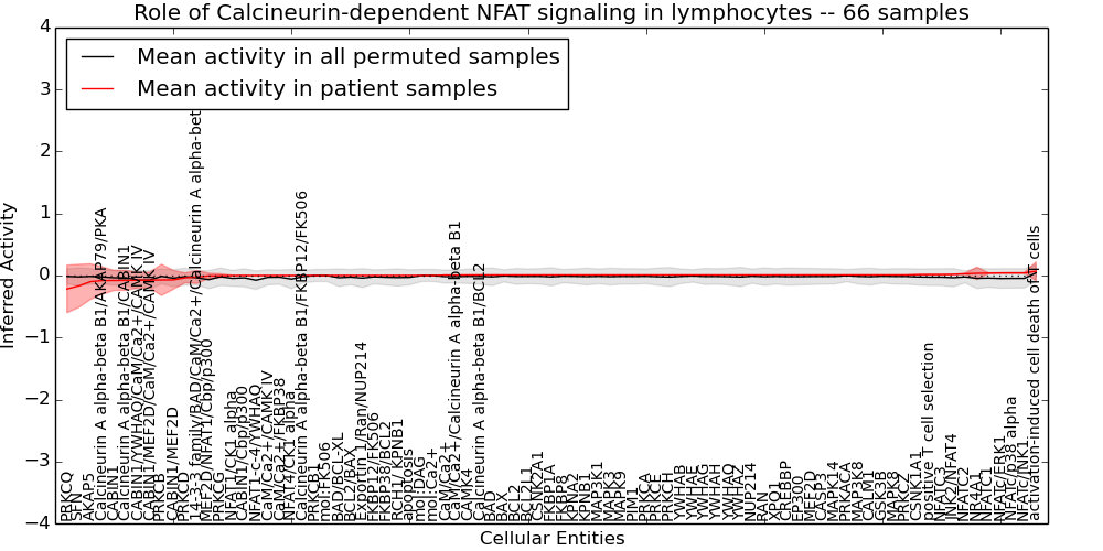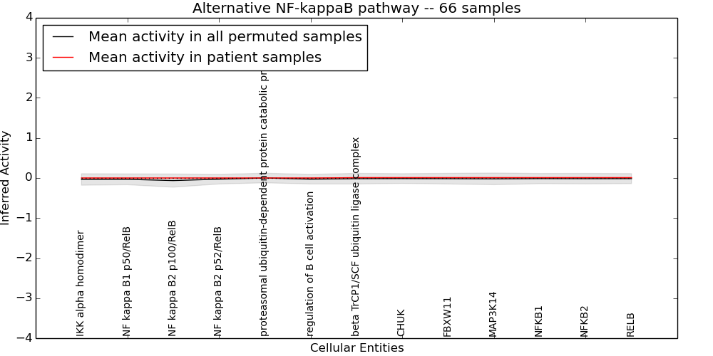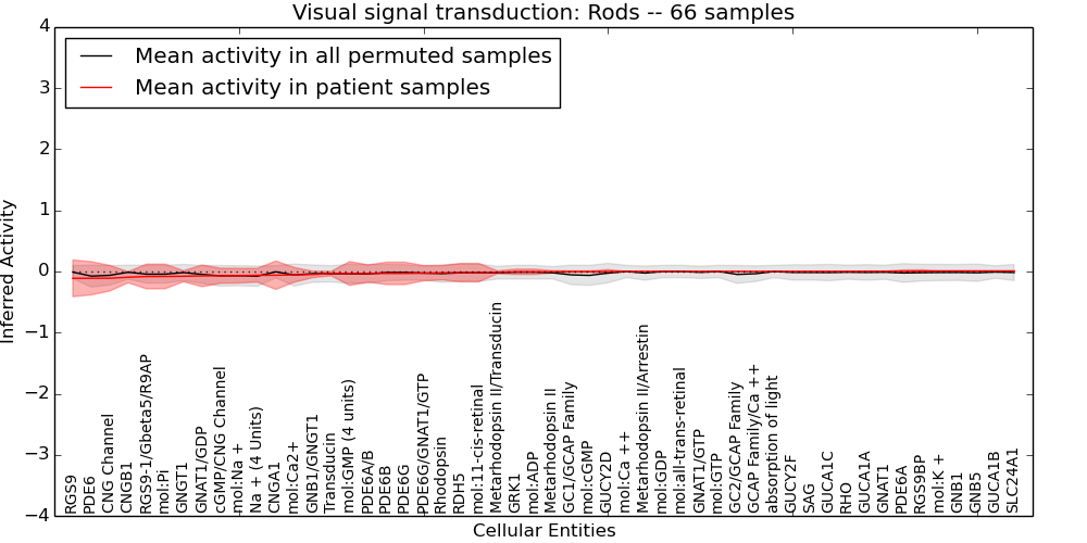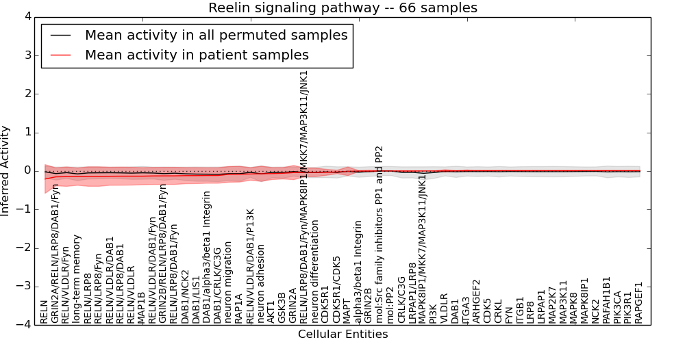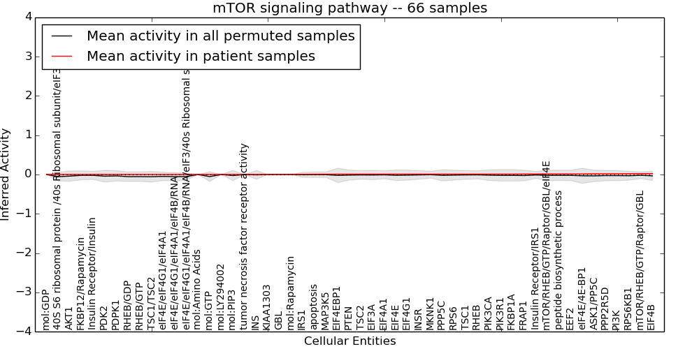 Figure S131. Get High-res Image This plot shows pathway concept perturbations across all samples against a permutation model. The concepts along the x-axis are sorted by lowest to highest mean activity for the real patient samples. Mean inferred activities are plotted along the y-axis as a colored band showing the average level and one standard deviation range. Real samples are shown in red and permuted samples in black.