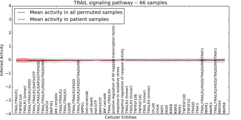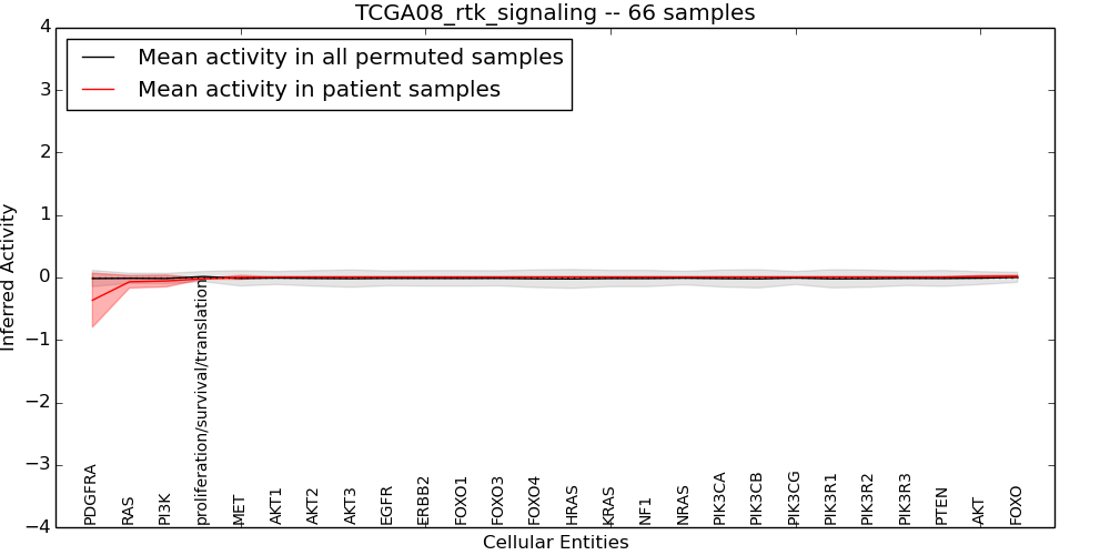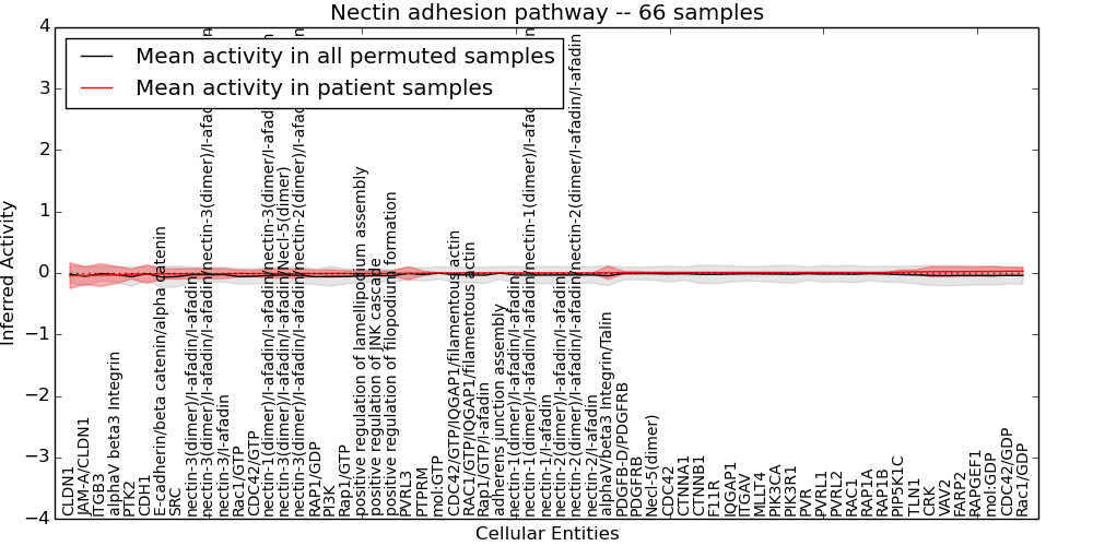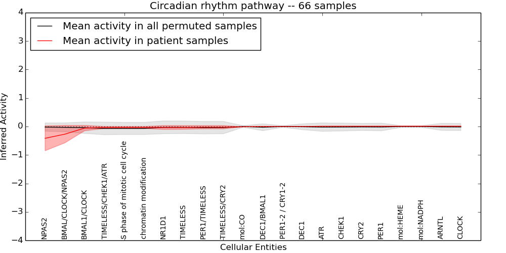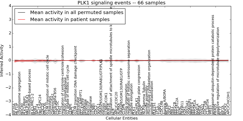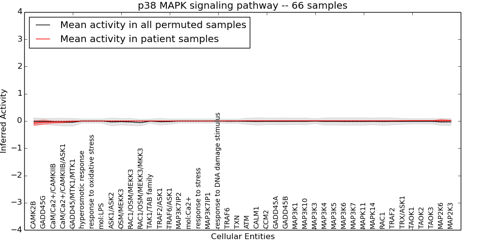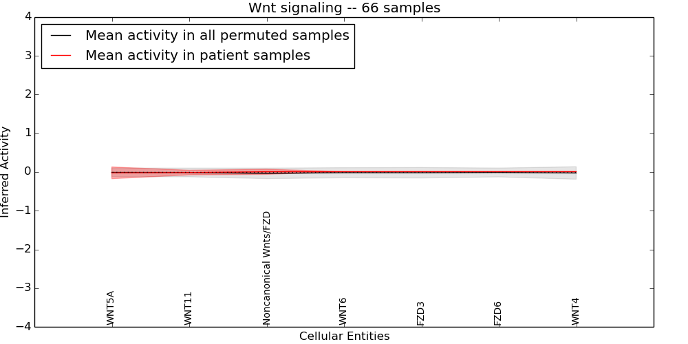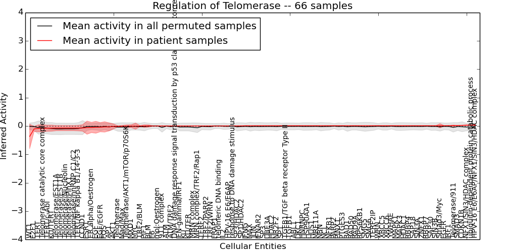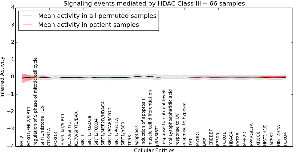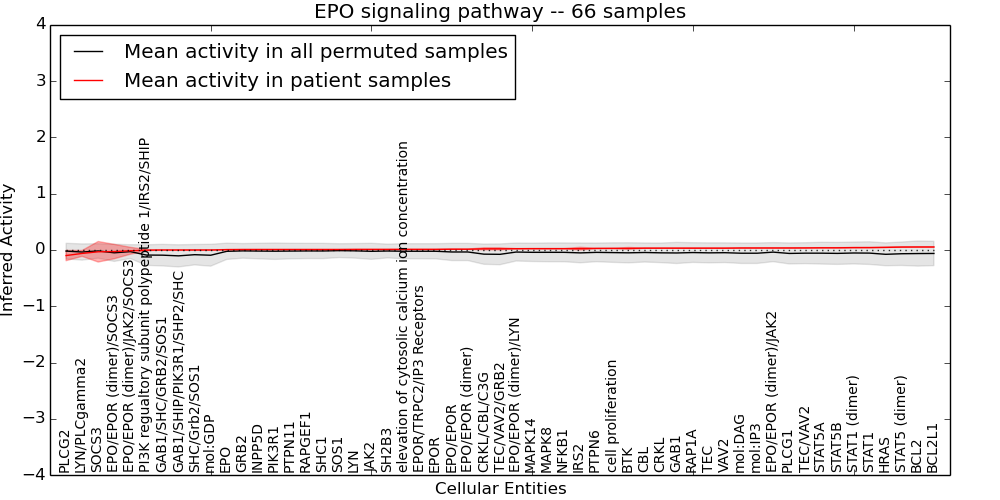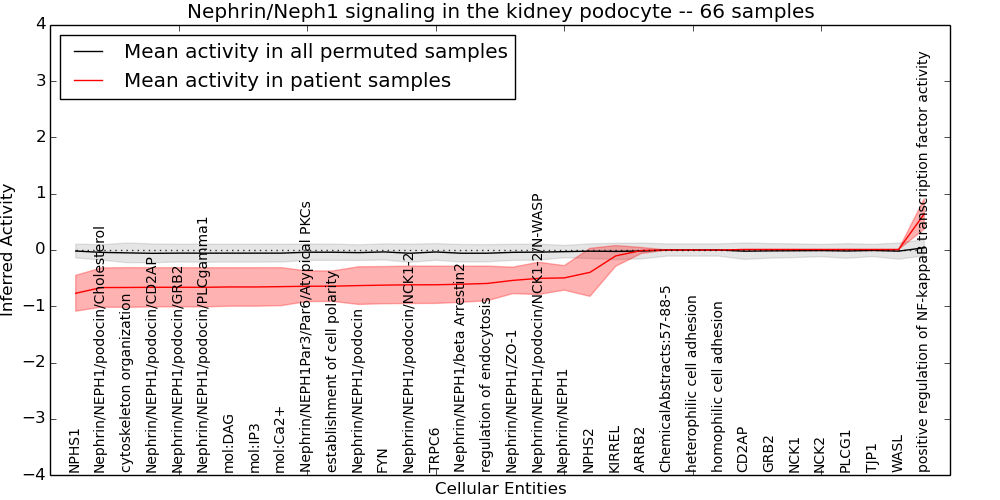 Figure S131. Get High-res Image This plot shows pathway concept perturbations across all samples against a permutation model. The concepts along the x-axis are sorted by lowest to highest mean activity for the real patient samples. Mean inferred activities are plotted along the y-axis as a colored band showing the average level and one standard deviation range. Real samples are shown in red and permuted samples in black.