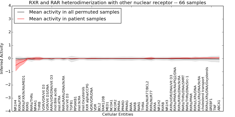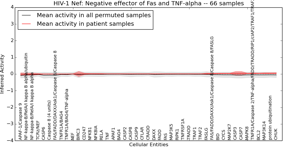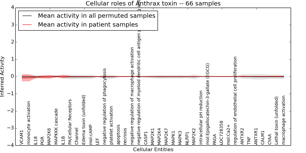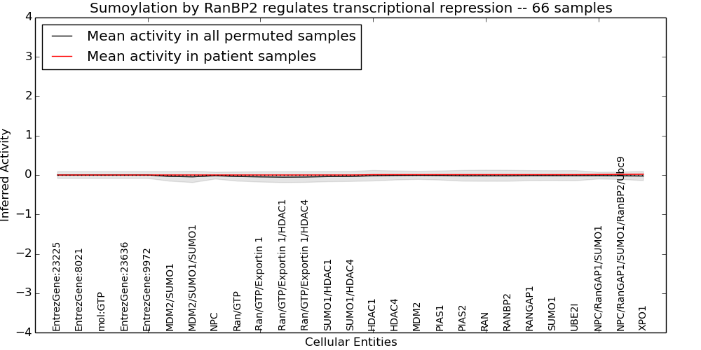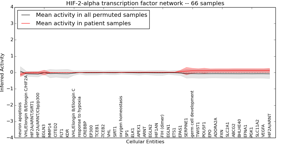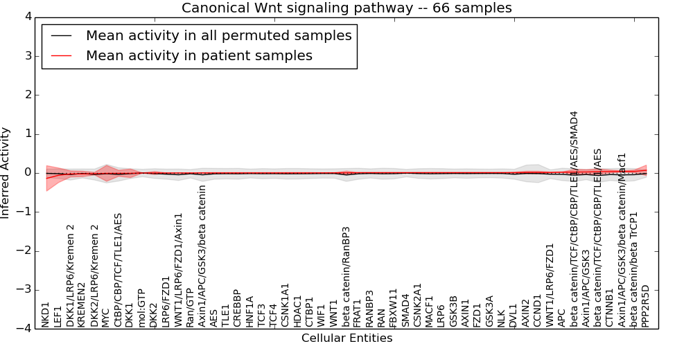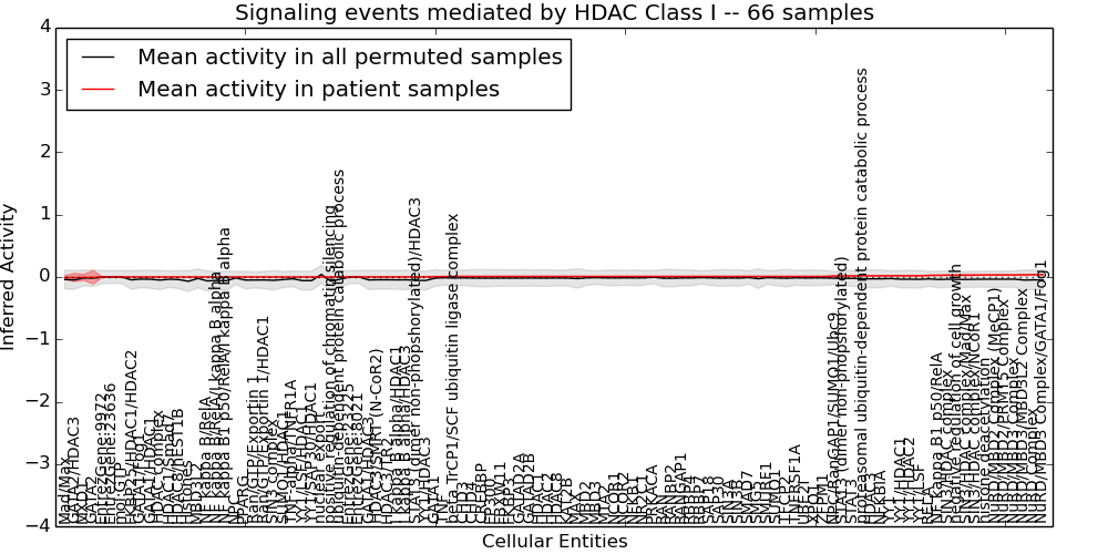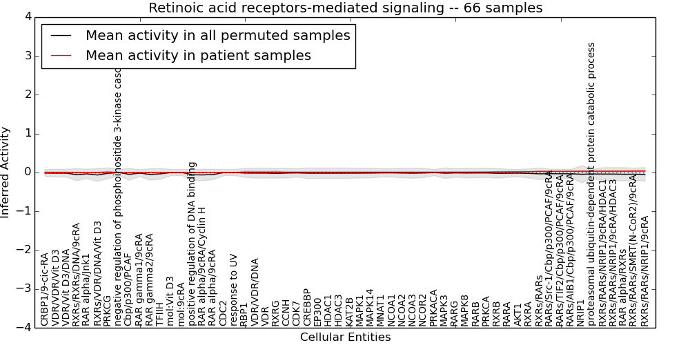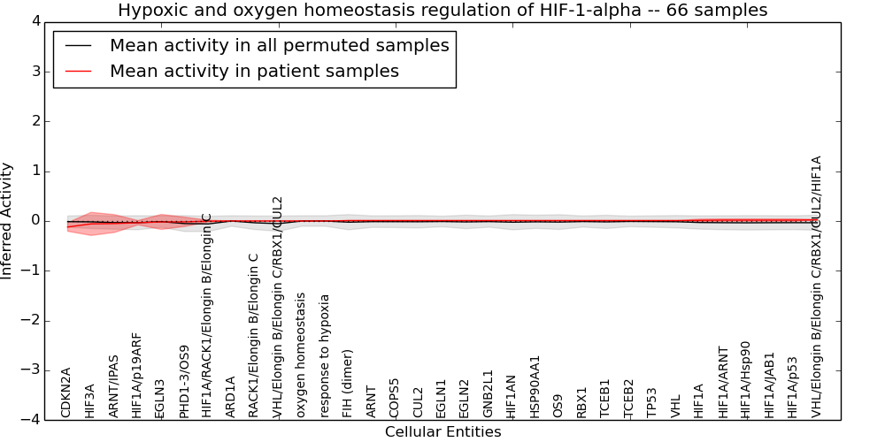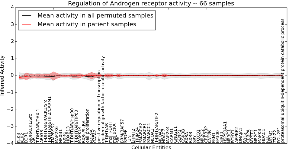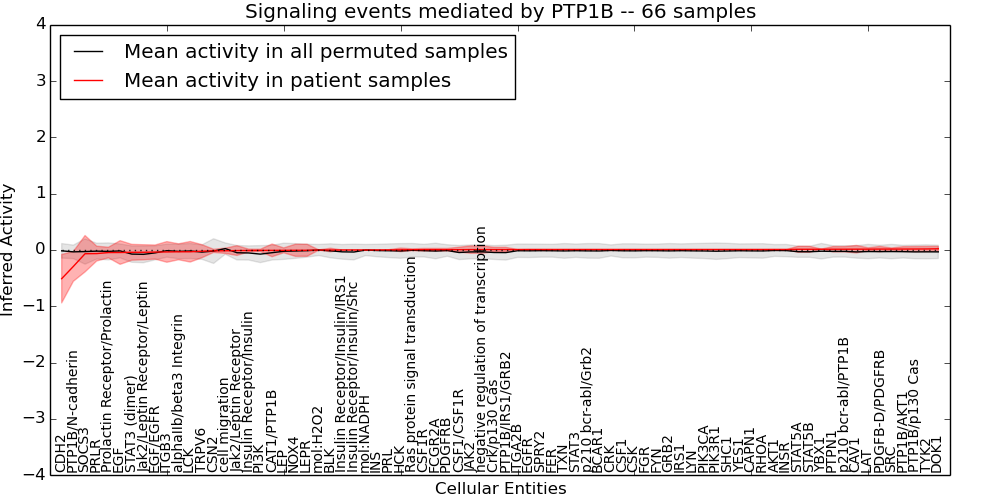 Figure S131. Get High-res Image This plot shows pathway concept perturbations across all samples against a permutation model. The concepts along the x-axis are sorted by lowest to highest mean activity for the real patient samples. Mean inferred activities are plotted along the y-axis as a colored band showing the average level and one standard deviation range. Real samples are shown in red and permuted samples in black.