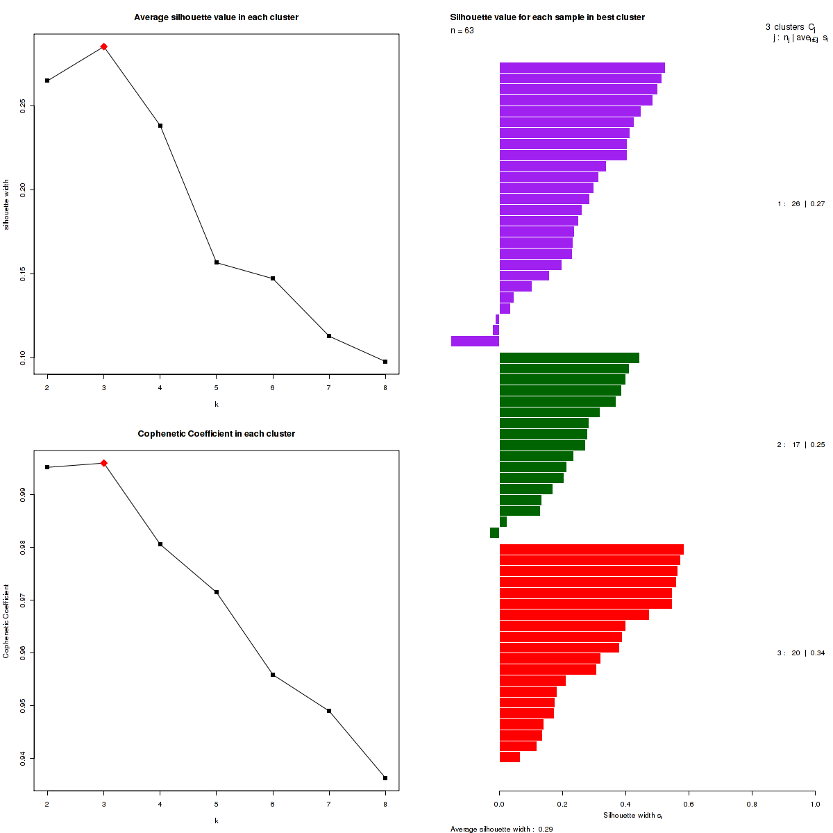 Figure 3. Get High-res Image The silhouette width was calculated for each sample and each value of k. The left upper panel shows the average silhouette width across all samples for each tested k (left upper panel). The left lower panel shows the Cophenetic Correlation Coefficients for each tested k. The right panel shows assignments of clusters to samples and the silhouette width of each sample for the most robust clustering.