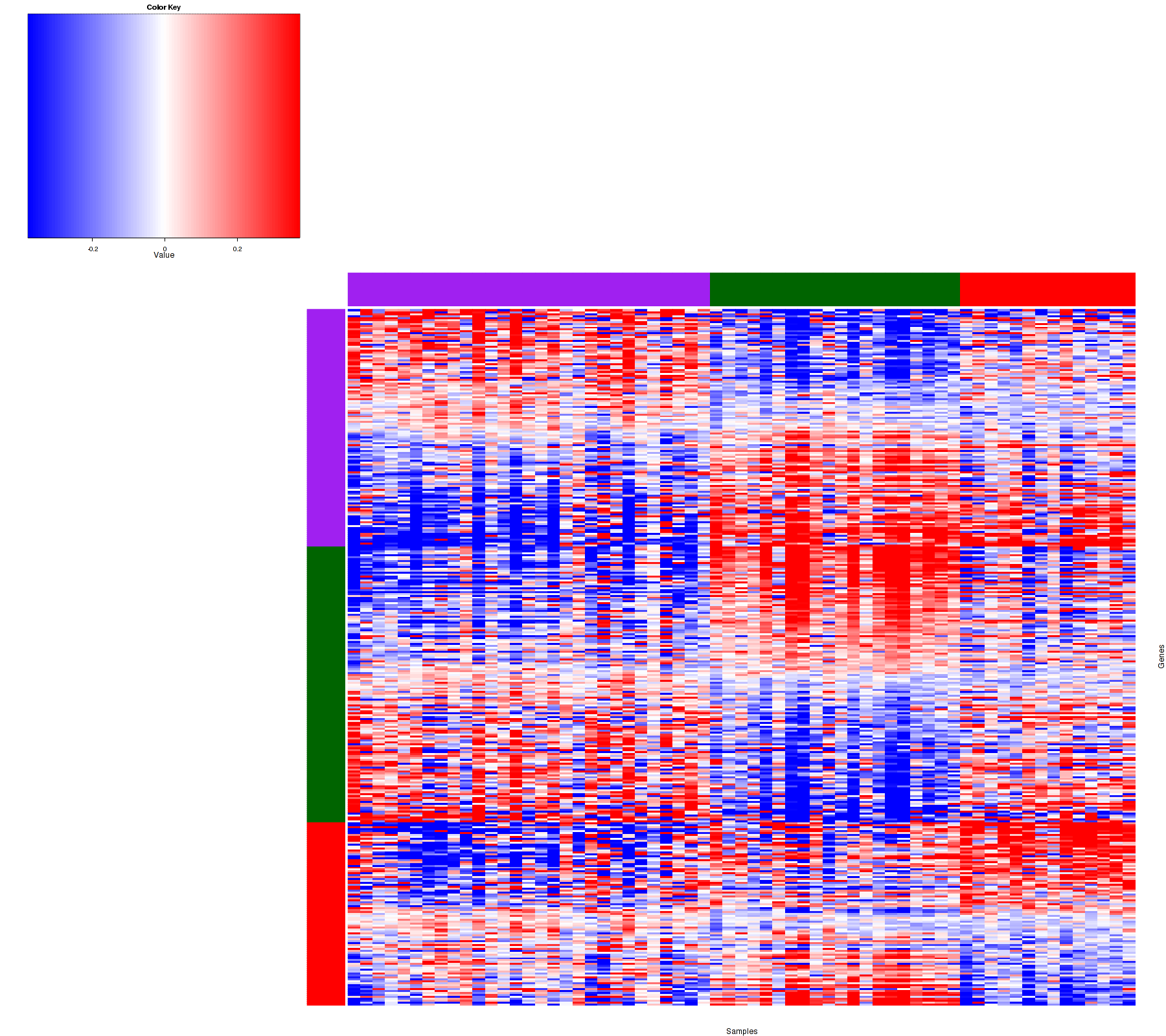 Figure 1. Get High-res Image Samples were separated into 3 clusters. Shown are 63 samples and 361 marker proteins. The color bar of the row indicates the marker proteins for the corresponding cluster.