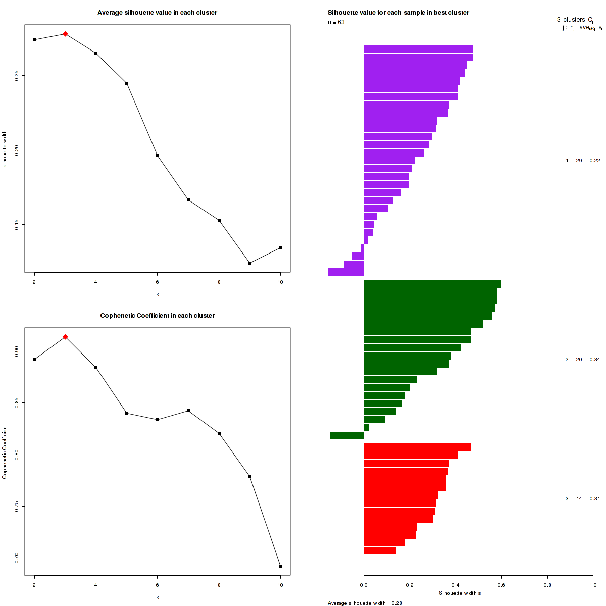 Figure 3. Get High-res Image The silhouette width was calculated for each sample and each value of k. The left upper panel shows the average silhouette width across all samples for each tested k (left upper panel). The left lower panel shows the Cophenetic Correlation Coefficients for each tested k. The right panel shows assignments of clusters to samples and the k silhouette width of each sample for the most robust clustering.