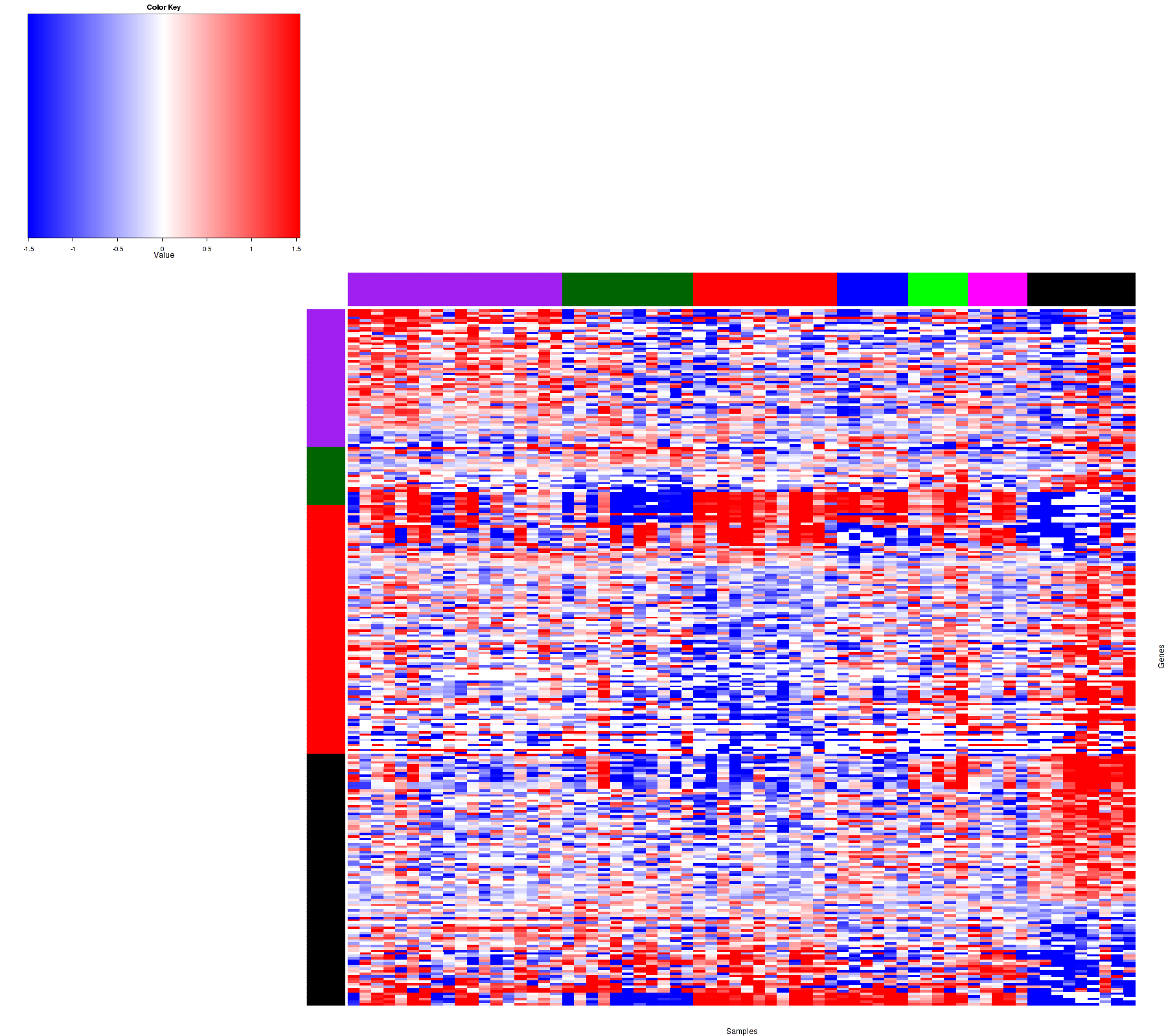 Figure 1.  Get High-res Image Samples were separated into 7 clusters. Shown are 66 samples and 274 marker miRs. The color bar of the row indicates the marker miRs for the corresponding cluster.