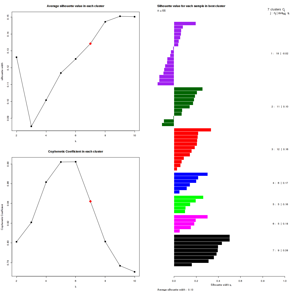 Silhouette widths, Cophenetic Correlation Coefficients and Consensus matrix