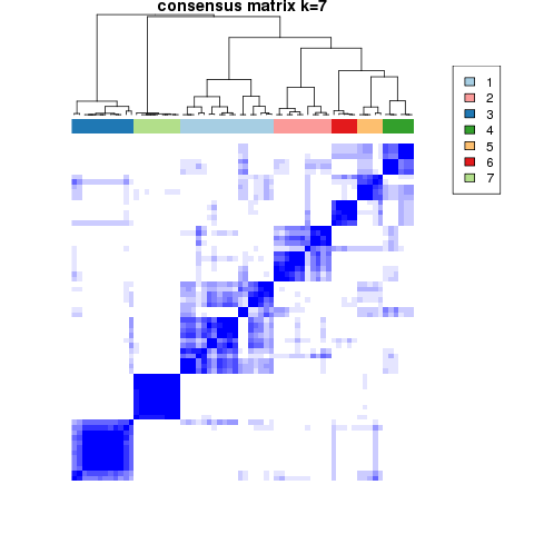 Figure 4.  Get High-res Image The consensus matrix after clustering shows 7 clusters with limited overlap between clusters.