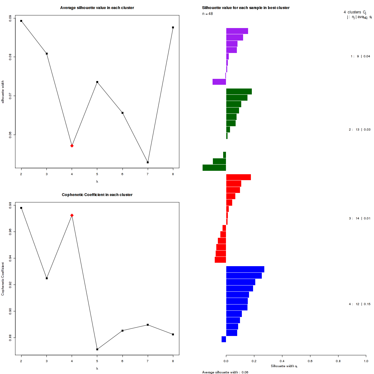 Figure 3. Get High-res Image The silhouette width was calculated for each sample and each value of k. The left upper panel shows the average silhouette width across all samples for each tested k (left upper panel). The left lower panel shows the Cophenetic Correlation Coefficients for each tested k. The right panel shows assignments of clusters to samples and the silhouette width of each sample for the most robust clustering.