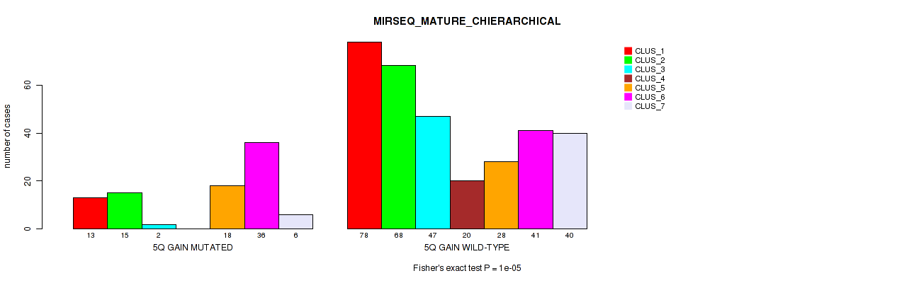 5q gain cnv correlated to 'CN_CNMF', 'METHLYATION_CNMF', 'RPPA_CHIERARCHICAL', 'MRNASEQ_CNMF', 'MRNASEQ_CHIERARCHICAL', 'MIRSEQ_CNMF', 'MIRSEQ_CHIERARCHICAL', 'MIRSEQ_MATURE_CNMF', and 'MIRSEQ_MATURE_CHIERARCHICAL'.
