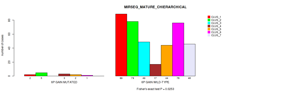 6p gain cnv correlated to 'RPPA_CNMF', 'MRNASEQ_CHIERARCHICAL', 'MIRSEQ_MATURE_CNMF', and 'MIRSEQ_MATURE_CHIERARCHICAL'.