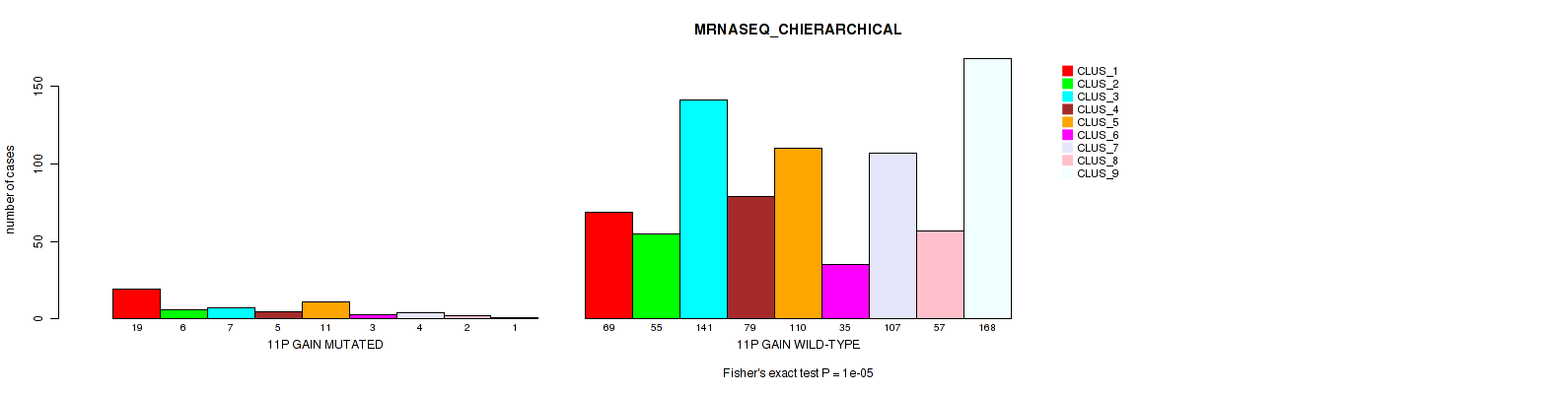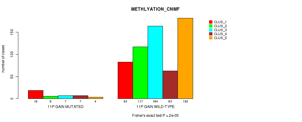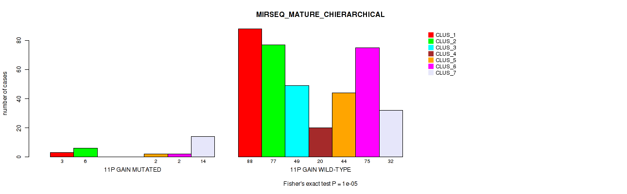 11p gain cnv correlated to 'CN_CNMF', 'METHLYATION_CNMF', 'MRNASEQ_CNMF', 'MRNASEQ_CHIERARCHICAL', 'MIRSEQ_CHIERARCHICAL', 'MIRSEQ_MATURE_CNMF', and 'MIRSEQ_MATURE_CHIERARCHICAL'.