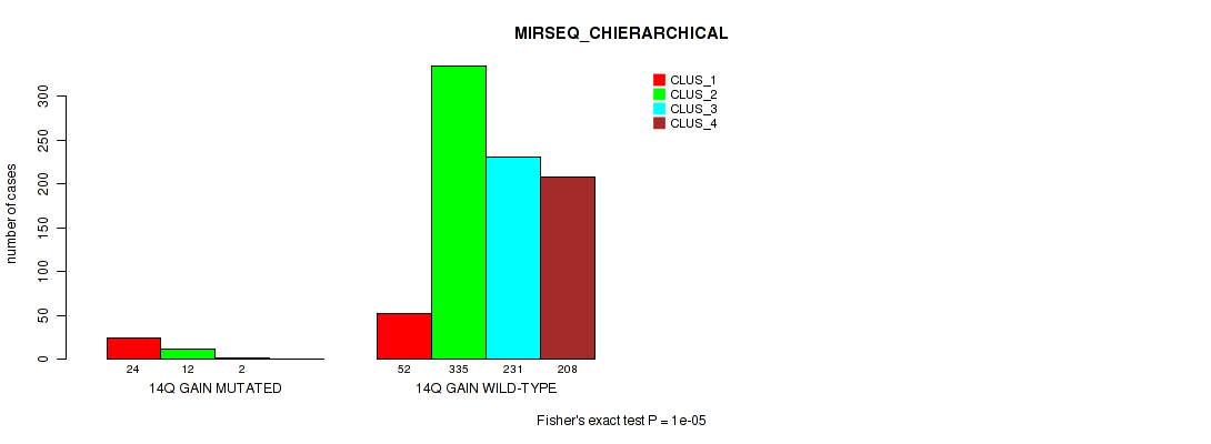 14q gain cnv correlated to 'CN_CNMF', 'METHLYATION_CNMF', 'RPPA_CHIERARCHICAL', 'MRNASEQ_CNMF', 'MRNASEQ_CHIERARCHICAL', 'MIRSEQ_CNMF', 'MIRSEQ_CHIERARCHICAL', 'MIRSEQ_MATURE_CNMF', and 'MIRSEQ_MATURE_CHIERARCHICAL'.