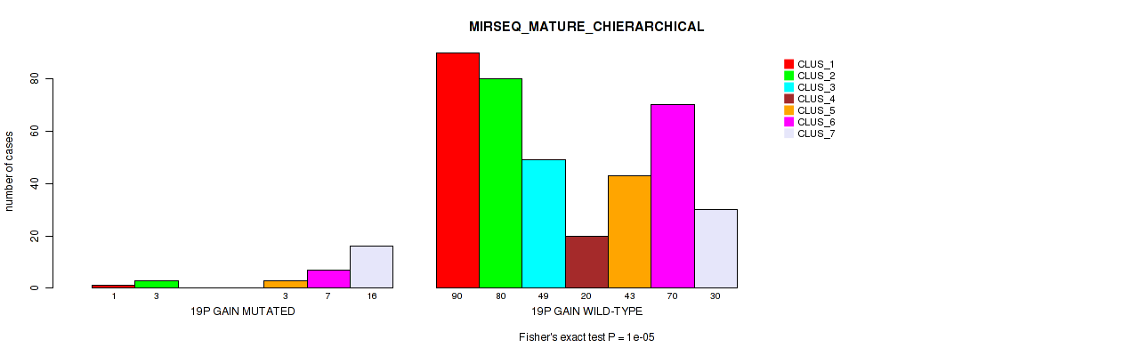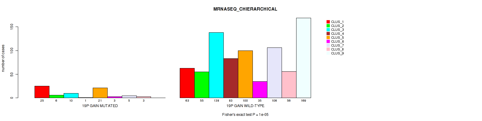 19p gain cnv correlated to 'CN_CNMF', 'METHLYATION_CNMF', 'RPPA_CHIERARCHICAL', 'MRNASEQ_CNMF', 'MRNASEQ_CHIERARCHICAL', 'MIRSEQ_CHIERARCHICAL', 'MIRSEQ_MATURE_CNMF', and 'MIRSEQ_MATURE_CHIERARCHICAL'.