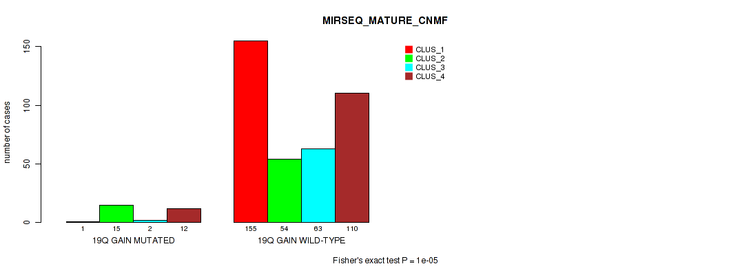 19q gain cnv correlated to 'CN_CNMF', 'METHLYATION_CNMF', 'RPPA_CHIERARCHICAL', 'MRNASEQ_CNMF', 'MRNASEQ_CHIERARCHICAL', 'MIRSEQ_CHIERARCHICAL', 'MIRSEQ_MATURE_CNMF', and 'MIRSEQ_MATURE_CHIERARCHICAL'.