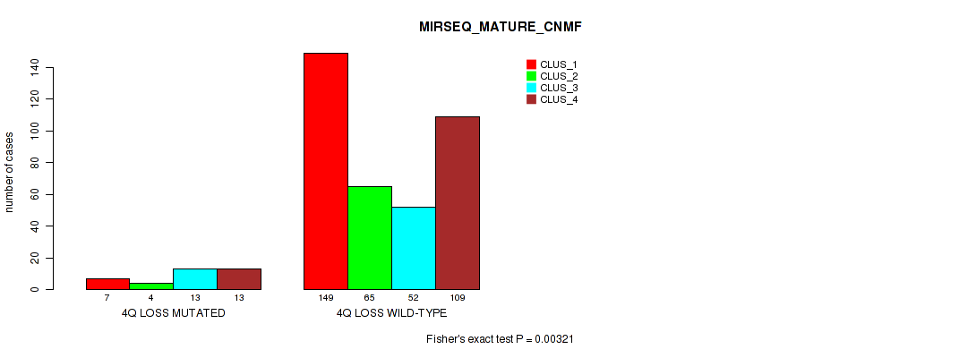 4q loss cnv correlated to 'CN_CNMF', 'METHLYATION_CNMF', 'RPPA_CHIERARCHICAL', 'MRNASEQ_CNMF', 'MRNASEQ_CHIERARCHICAL', 'MIRSEQ_CNMF', 'MIRSEQ_CHIERARCHICAL', 'MIRSEQ_MATURE_CNMF', and 'MIRSEQ_MATURE_CHIERARCHICAL'.