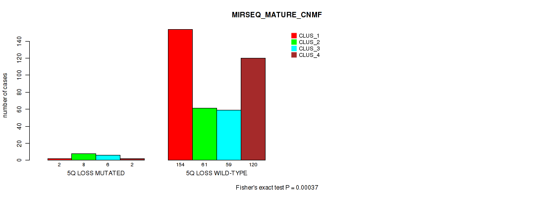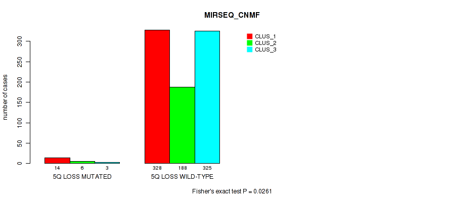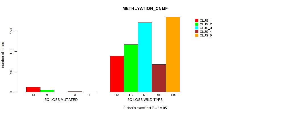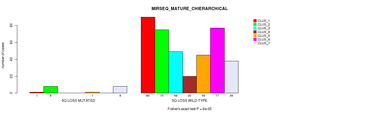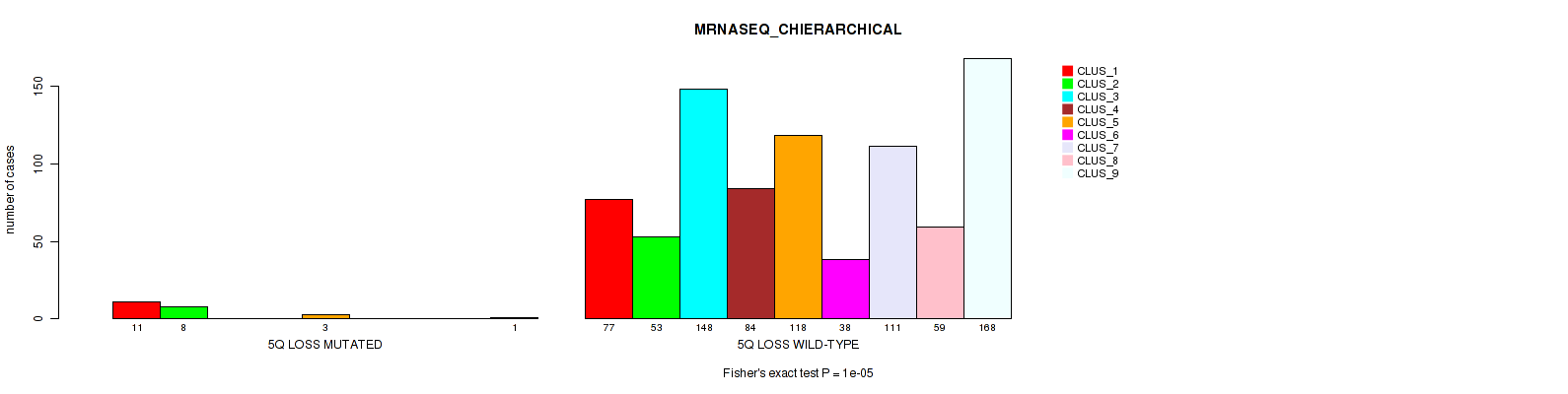 5q loss cnv correlated to 'CN_CNMF', 'METHLYATION_CNMF', 'MRNASEQ_CNMF', 'MRNASEQ_CHIERARCHICAL', 'MIRSEQ_CNMF', 'MIRSEQ_CHIERARCHICAL', 'MIRSEQ_MATURE_CNMF', and 'MIRSEQ_MATURE_CHIERARCHICAL'.