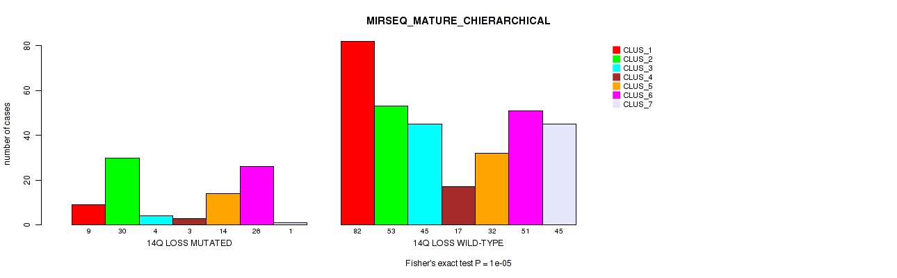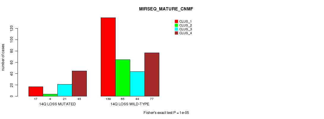 14q loss cnv correlated to 'MRNA_CNMF', 'MRNA_CHIERARCHICAL', 'CN_CNMF', 'METHLYATION_CNMF', 'RPPA_CNMF', 'RPPA_CHIERARCHICAL', 'MRNASEQ_CNMF', 'MRNASEQ_CHIERARCHICAL', 'MIRSEQ_CNMF', 'MIRSEQ_CHIERARCHICAL', 'MIRSEQ_MATURE_CNMF', and 'MIRSEQ_MATURE_CHIERARCHICAL'.