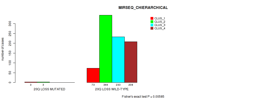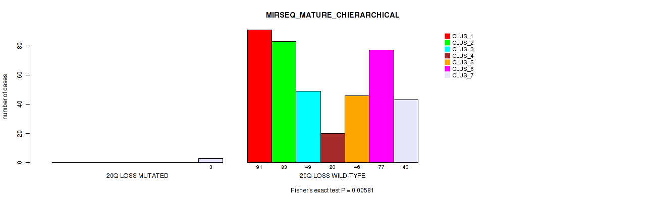 20q loss cnv correlated to 'METHLYATION_CNMF', 'MRNASEQ_CNMF', 'MRNASEQ_CHIERARCHICAL', 'MIRSEQ_CHIERARCHICAL', 'MIRSEQ_MATURE_CNMF', and 'MIRSEQ_MATURE_CHIERARCHICAL'.
