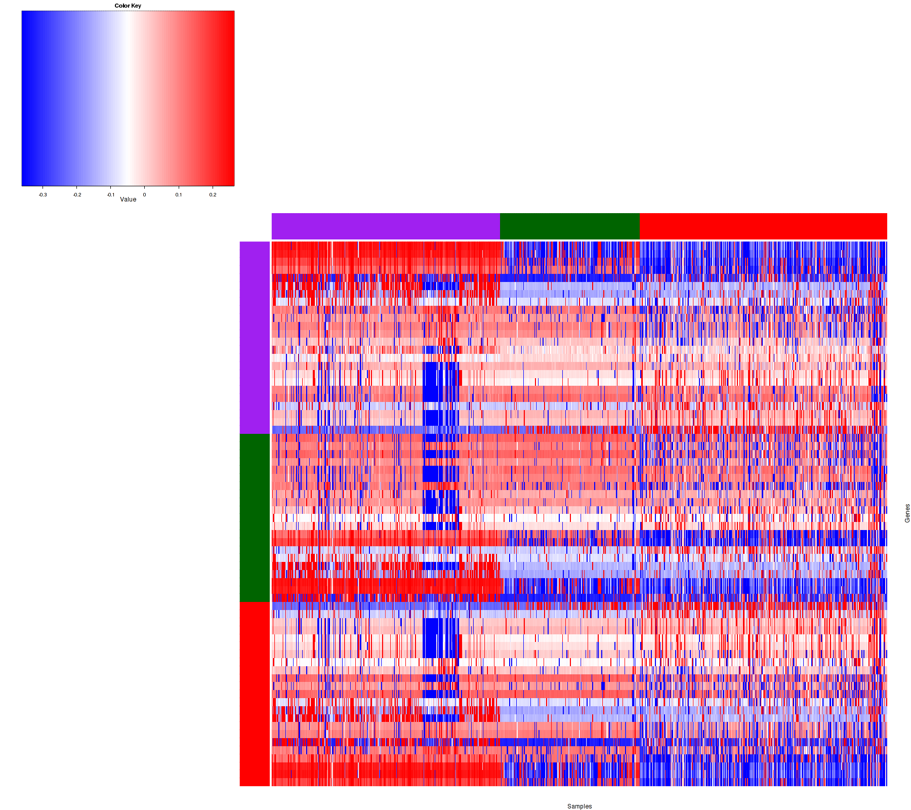 Figure 1. Get High-res Image Samples were separated into 3 clusters. Shown are 882 samples and 68 marker focal events. The color bar of the row indicates the marker focal events for the corresponding cluster.
