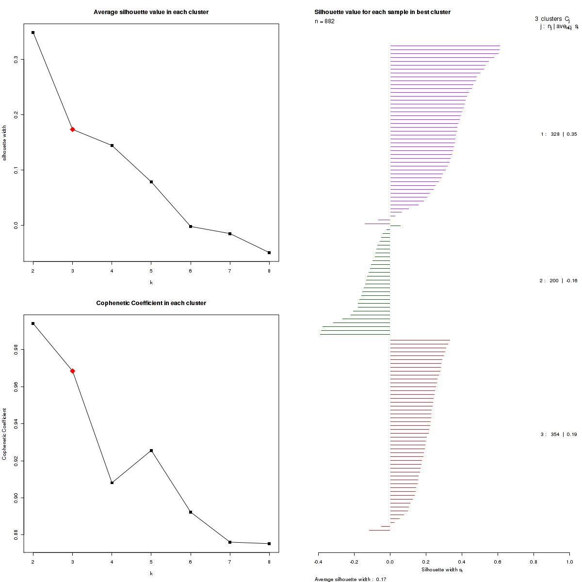 Figure 3. Get High-res Image The silhouette width was calculated for each sample and each value of k. The left panel shows the average silhouette width across all samples for each tested k (left panel). The right panels shows assignments of clusters to samples and the silhouette width of each sample for the most robust clustering.