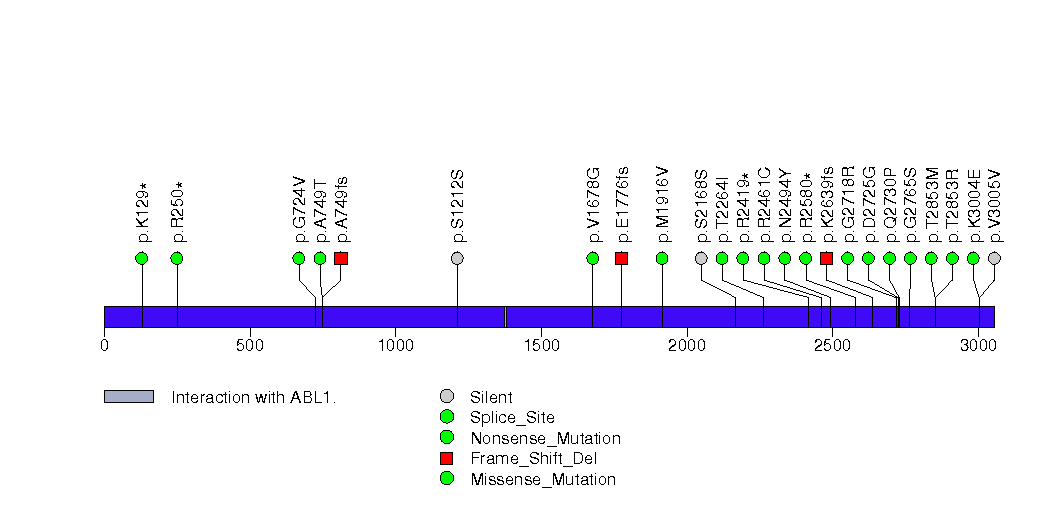 Figure S20. This figure depicts the distribution of mutations and mutation types across the ATM significant gene.