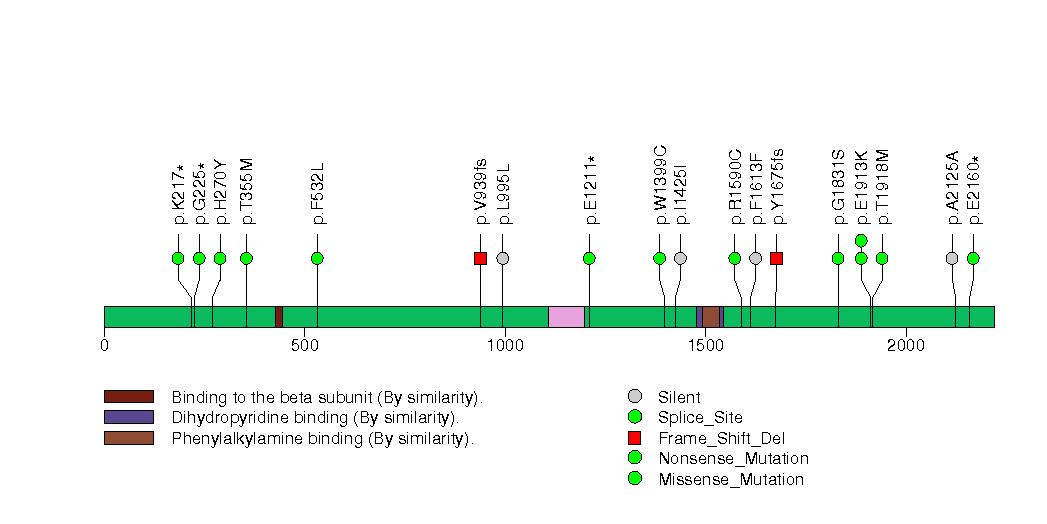 Figure S21. This figure depicts the distribution of mutations and mutation types across the CACNA1C significant gene.