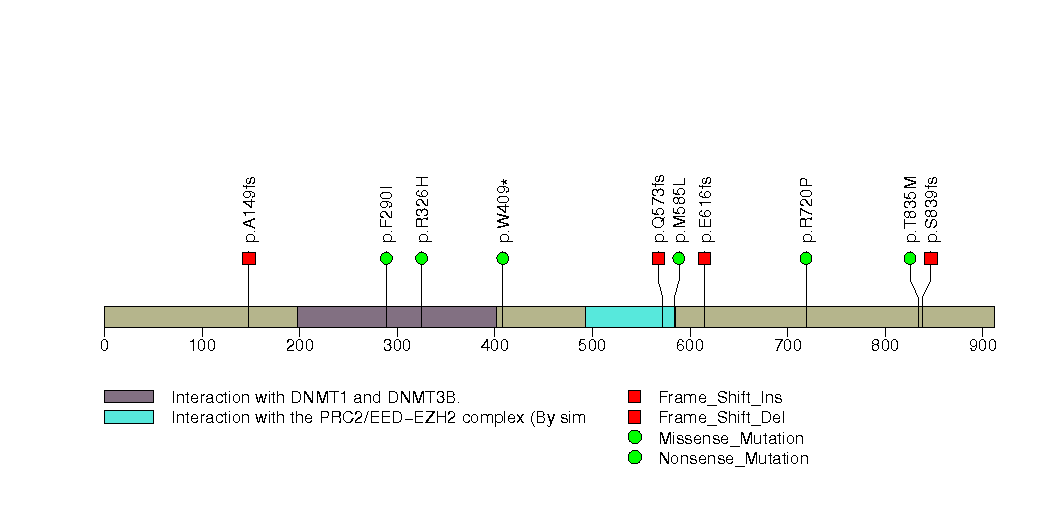 Figure S28. This figure depicts the distribution of mutations and mutation types across the DNMT3A significant gene.