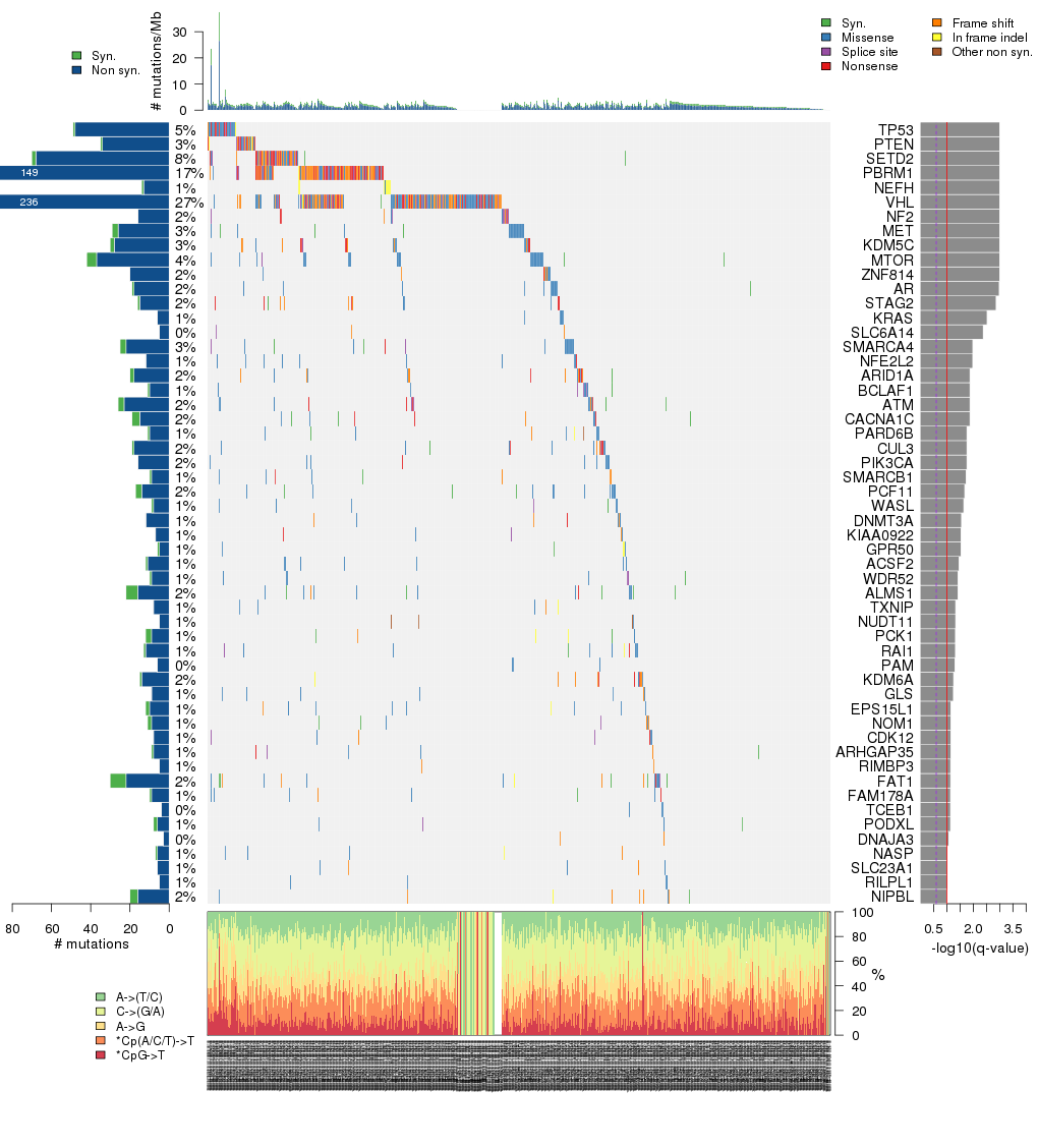 Figure 3. Get High-res Image The matrix in the center of the figure represents individual mutations in patient samples, color-coded by type of mutation, for the significantly mutated genes. The rate of synonymous and non-synonymous mutations is displayed at the top of the matrix. The barplot on the left of the matrix shows the number of mutations in each gene. The percentages represent the fraction of tumors with at least one mutation in the specified gene. The barplot to the right of the matrix displays the q-values for the most significantly mutated genes. The purple boxplots below the matrix (only displayed if required columns are present in the provided MAF) represent the distributions of allelic fractions observed in each sample. The plot at the bottom represents the base substitution distribution of individual samples, using the same categories that were used to calculate significance.