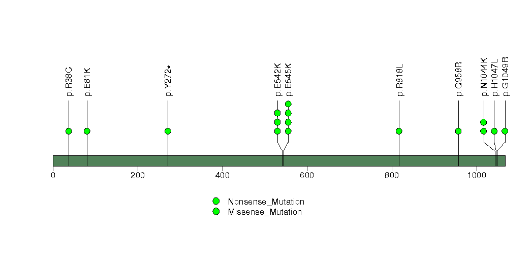 Figure S24. This figure depicts the distribution of mutations and mutation types across the PIK3CA significant gene.