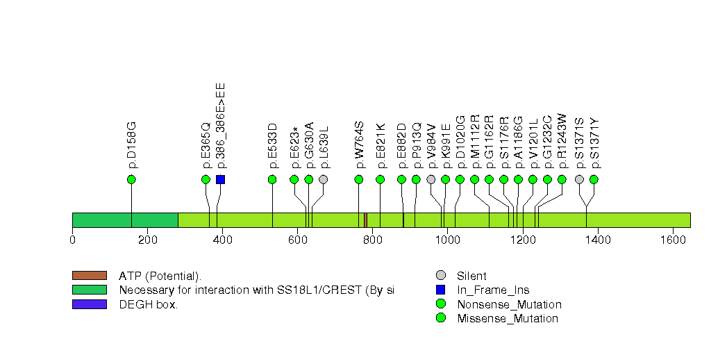 Figure S16. This figure depicts the distribution of mutations and mutation types across the SMARCA4 significant gene.
